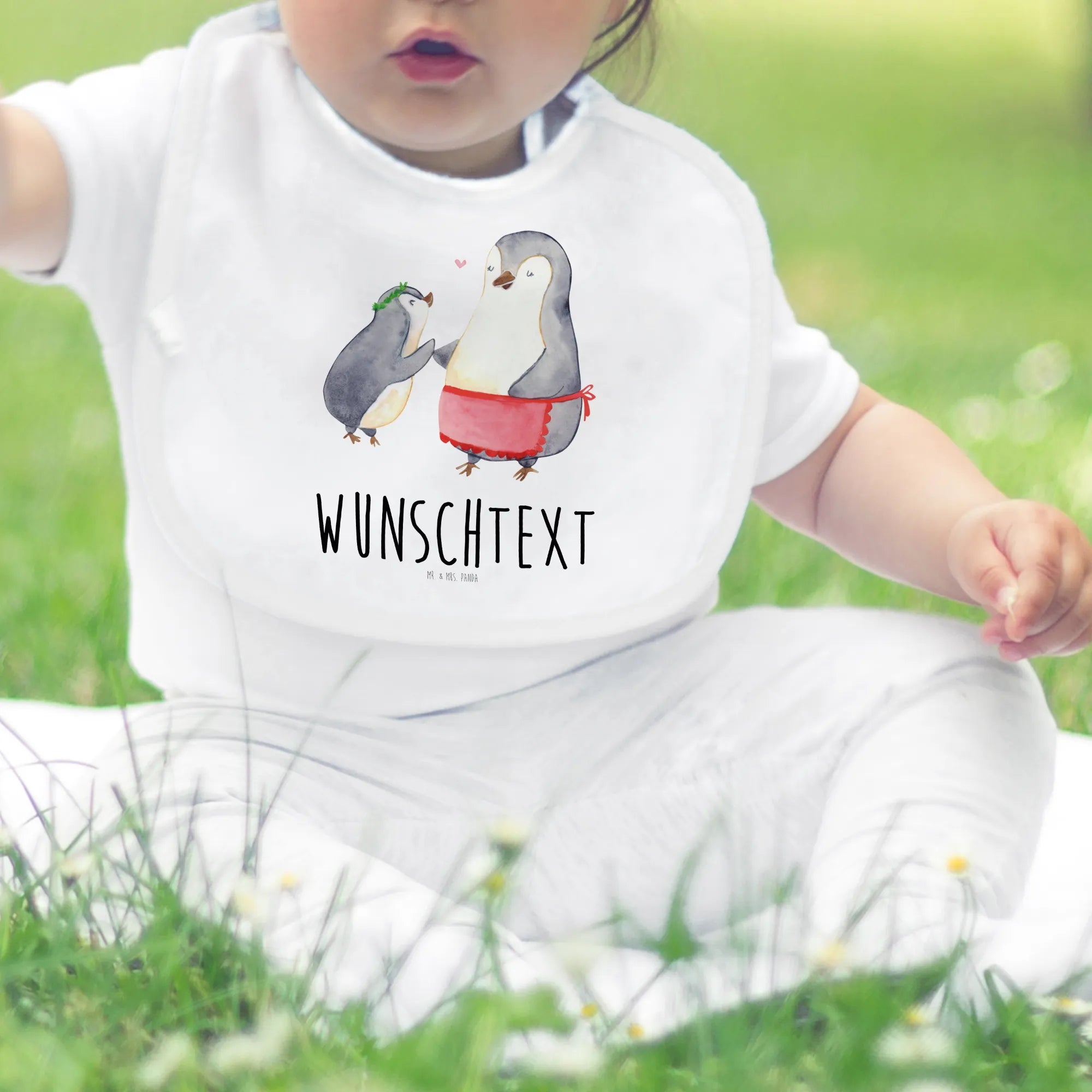 Das personalisierte Babylätzchen mit dem bezaubernden Motiv Pinguin mit Kind ist das perfekte Geschenk für alle frischen Eltern und ihre kleinen Lieblinge. Hergestellt aus 100% Öko Baumwolle, ist es nicht nur ultraweich und angenehm für die zarte Babyhaut, sondern auch umweltfreundlich. Die liebevolle Illustration zeigt einen großen Pinguin in einer roten Schürze, der fürsorglich zu seinem kleinen Pinguin-Kind hinabblickt, das ihm mit einem grünen Kranz auf dem Kopf verzaubert entgegenblickt. Diese Szene symbolisiert die besondere Bindung zwischen Mama und Kind und wird durch ein kleines Herz ergänzt, was die herzliche Verbindung verdeutlicht.