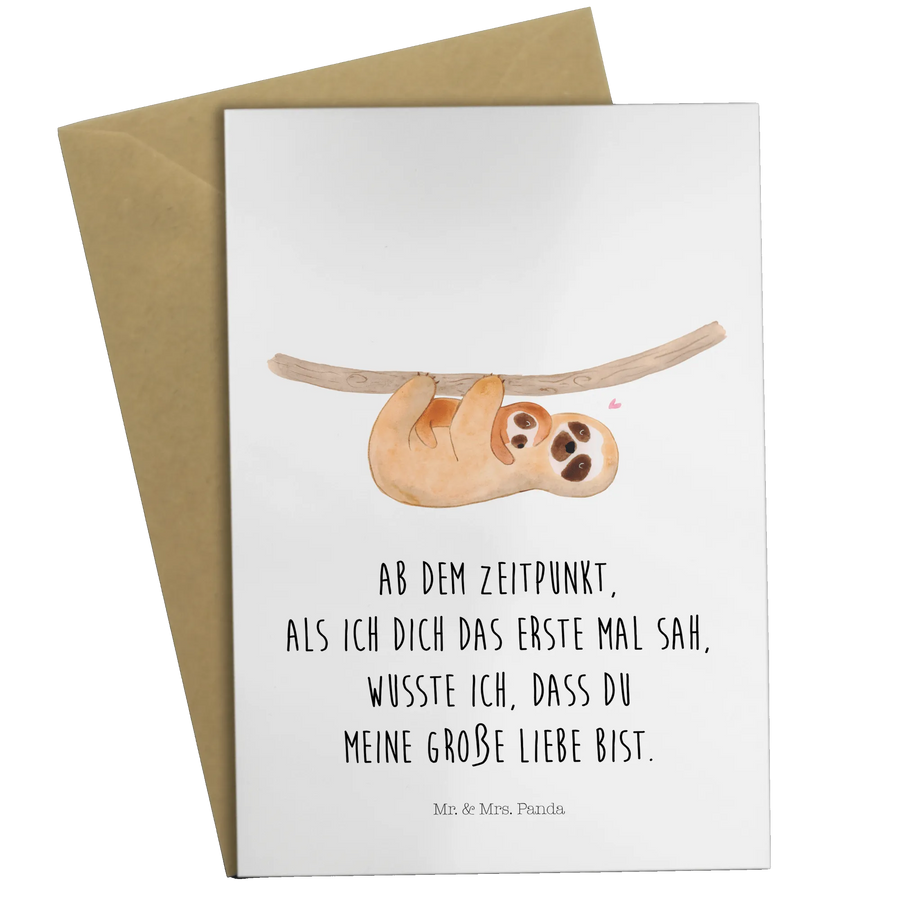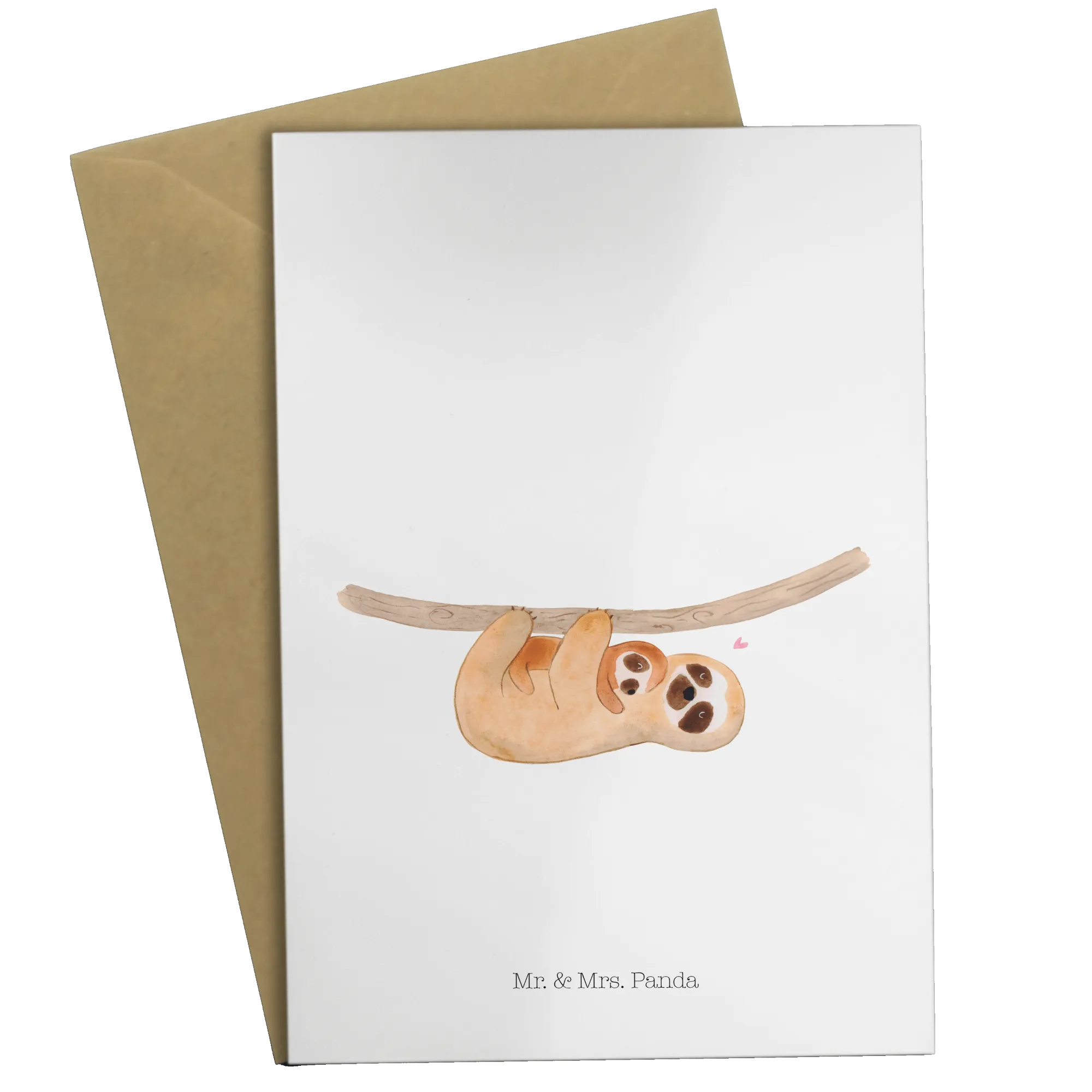 Die Grußkarte "Faultier mit Kind" aus der Faultier - Kollektion von Mr. & Mrs. Panda ist der perfekte Begleiter für all Deine besonderen Anlässe! Mit einem zauberhaften Motiv, das ein süßes Faultier zeigt, welches liebevoll sein schlafendes Baby umarmt, bringt diese Karte ein Gefühl von Geborgenheit und Zuneigung in die Welt der Grußkarten. Ob zur Geburt eines Kindes, als Glückwunsch zur Hochzeit oder einfach als liebevolle Nachricht für Freunde und Familie – diese Grußkarte ist ein wahrhaft einzigartiges Kunstwerk.