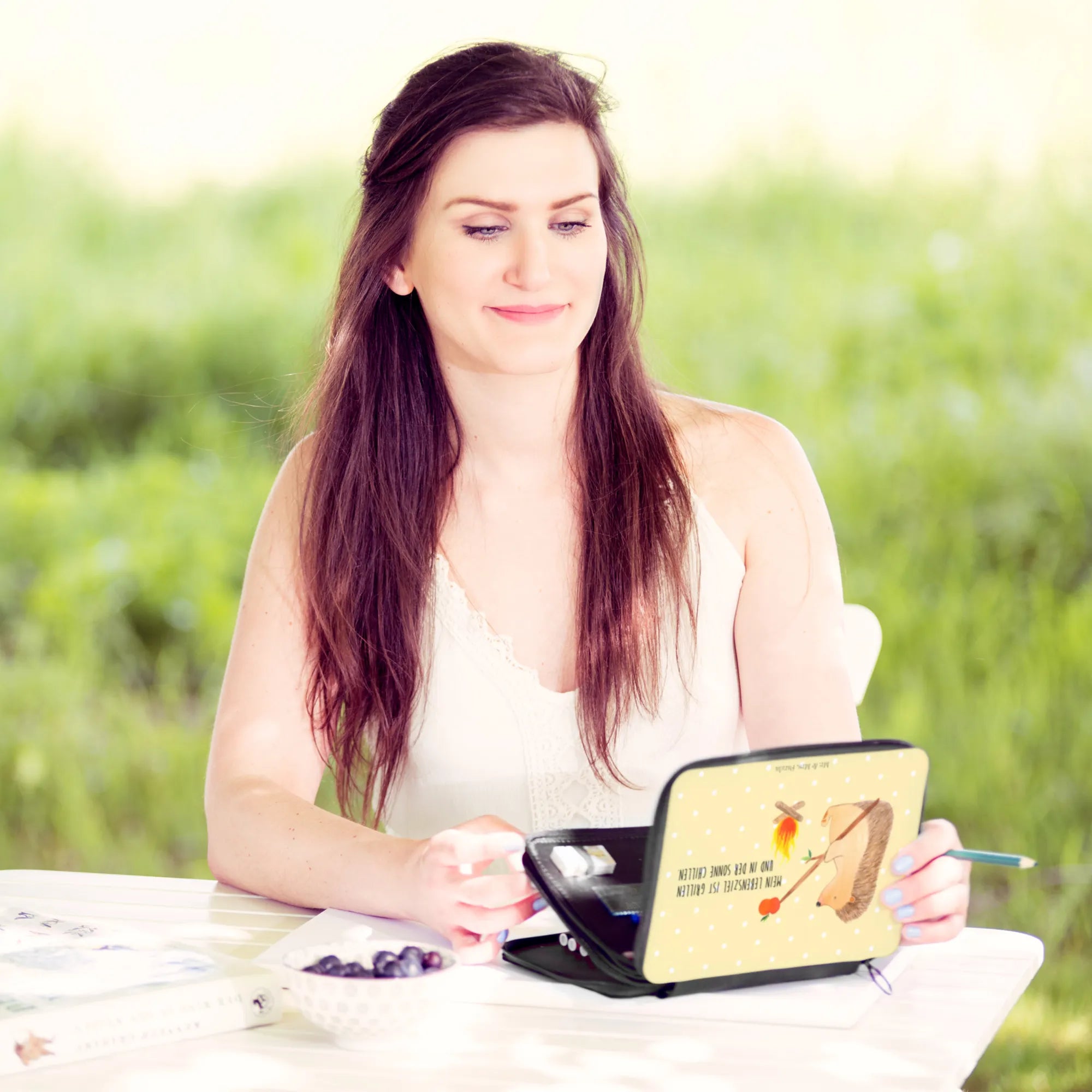 Entdecke die zauberhafte Federmappe "Igel grillt" aus der beliebten Small World Kollektion von Mr. & Mrs. Panda! Diese wunderschöne Federmappe, bedruckt mit einem niedlichen Igel, der um ein Lagerfeuer sitzt und genüsslich einen Apfel grillt, bringt Freude und Gute Laune in jeden Schulranzen. Der einzigartige Slogan "Mein Lebensziel ist grillen und in der Sonne chillen." weckt nicht nur Erinnerungen an warme Sommertage, sondern inspiriert auch kleine grüne Daumen, ihre Grillkünste zu entwickeln.