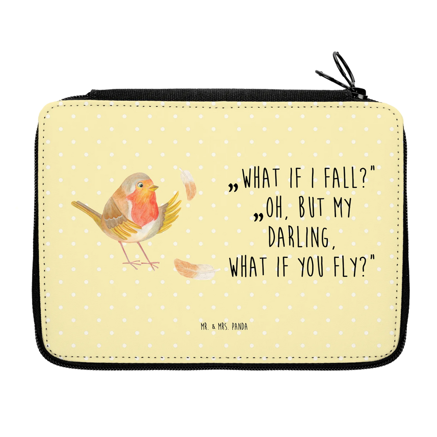Entdecke die zauberhafte Federmappe "Rotkehlchen mit Federn" von Mr. & Mrs. Panda! Diese wunderschöne Stiftetasche ist nicht nur praktisch für die Schule, sondern auch ein echter Blickfang. Mit ihrem liebevoll gestalteten Motiv des niedlichen Rotkehlchens und bunten Federn bringt sie Freude in den Schulalltag. Der Spruch: „What if I fall? Oh, but my darling, what if you fly?“ inspiriert kleine Entdecker dazu, ihre Träume zu verfolgen und neue Abenteuer zu wagen. Erlebe die Faszination und das Abenteuer schon beim Auspacken!