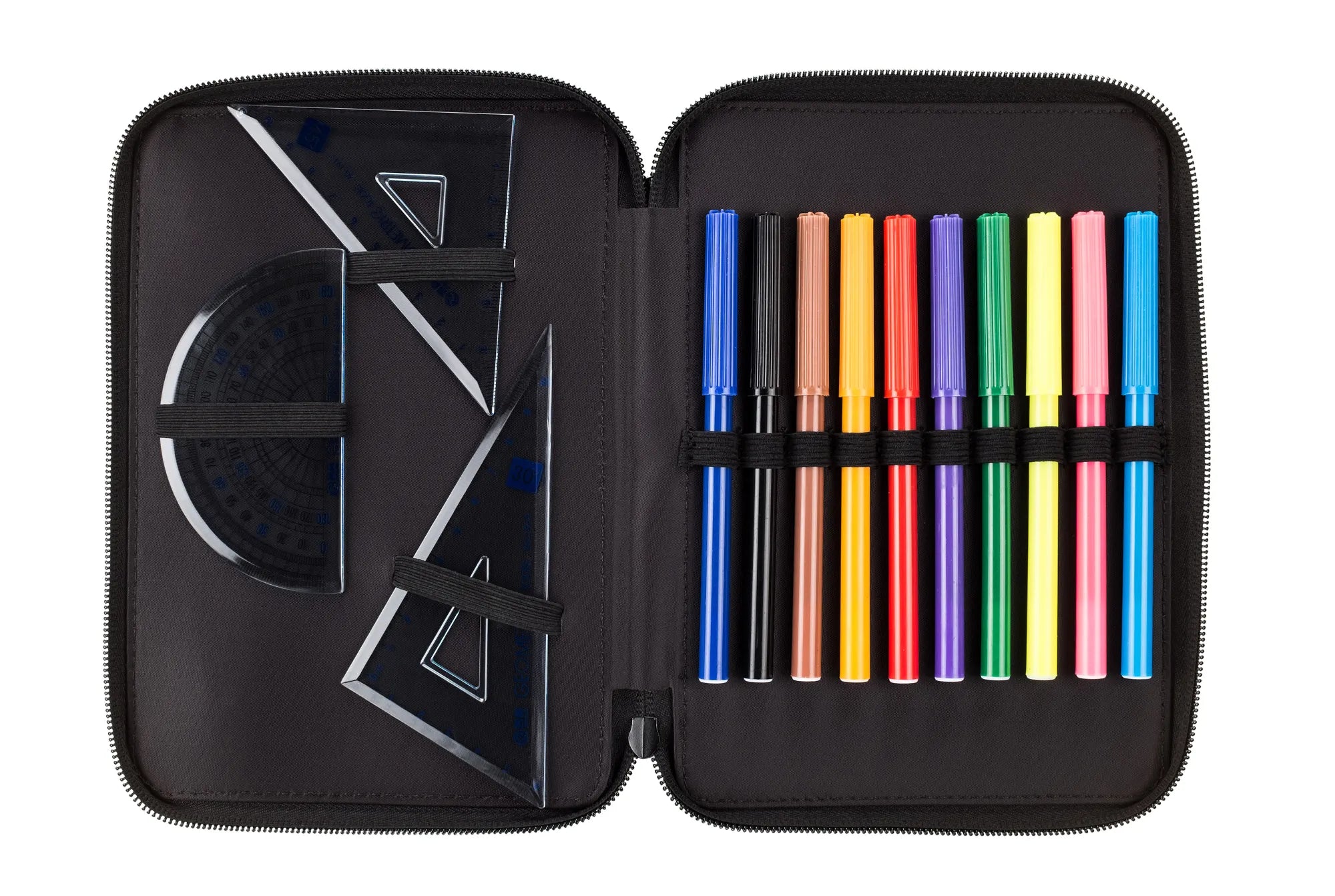 Außerdem kommt sie komplett ausgestattet mit Buntstiften, Filzstiften, Bleistiften, einem Lineal, einem Radiergummi und einem Spitzer – ein echtes Must-Have für jeden Schulranzen!