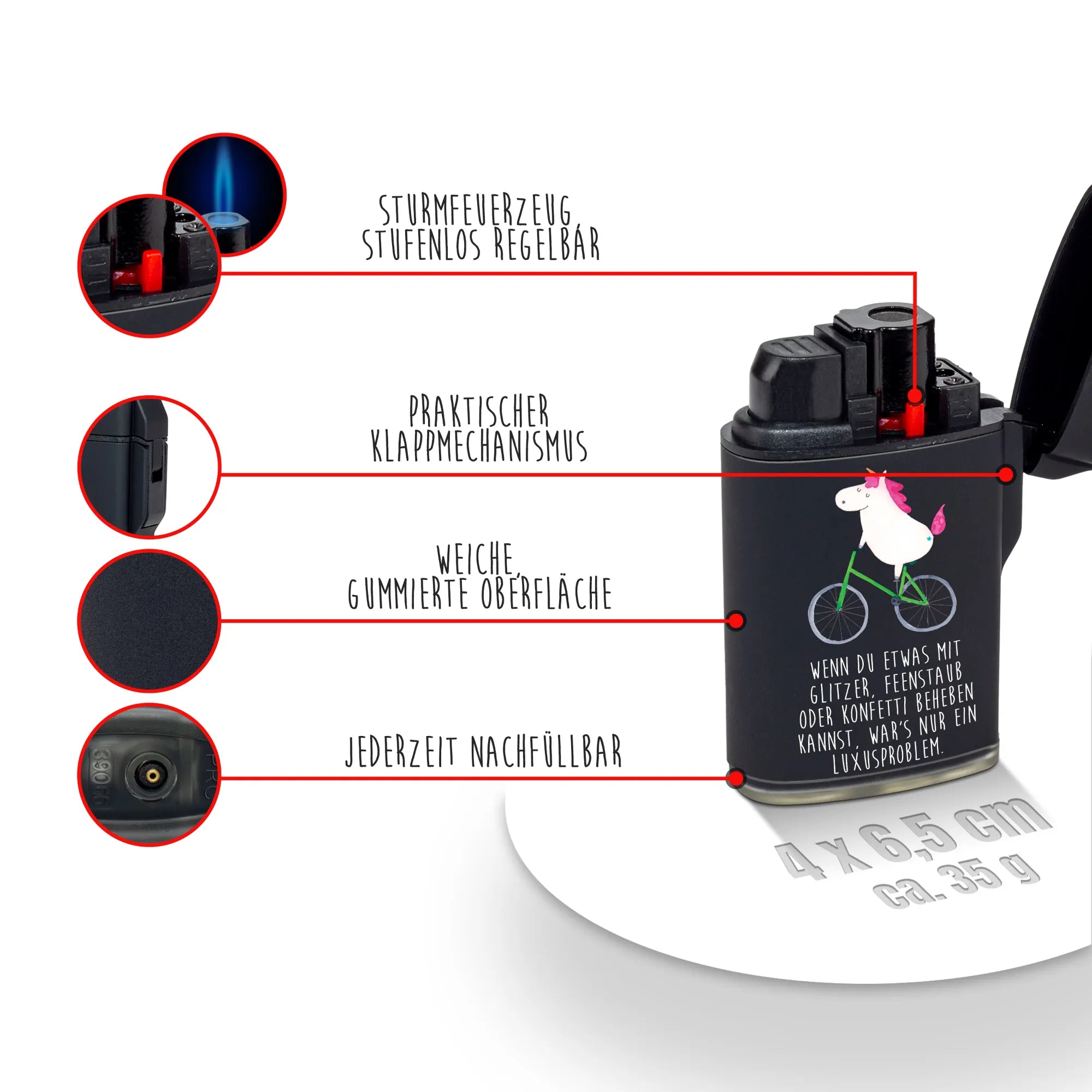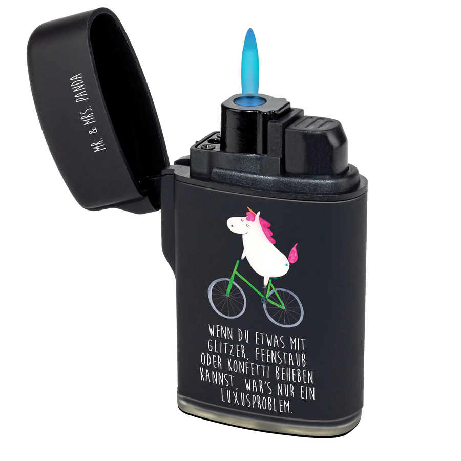 Entdecke das zauberhafte Feuerzeug "Einhorn Radfahrer" aus der Einhorn-Kollektion von Mr. & Mrs. Panda! Dieses hochwertige Feuerzeug ist nicht nur ein praktischer Begleiter, sondern auch ein echter Hingucker.