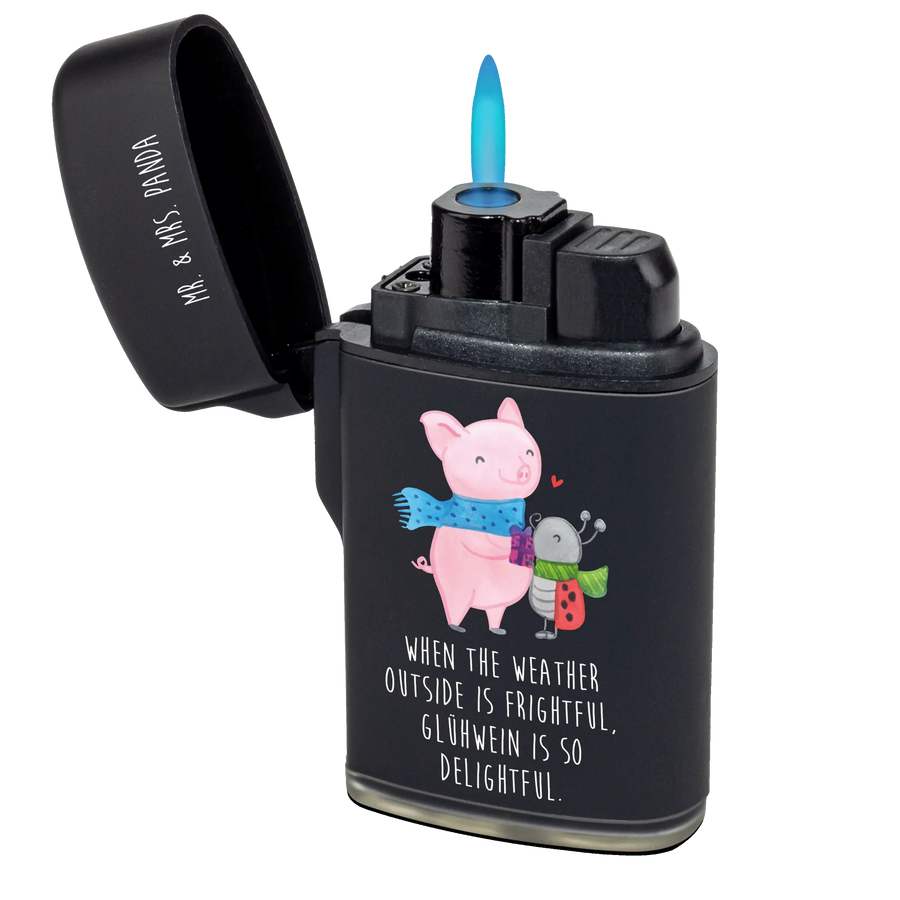 Mit einem charmanten, handgezeichneten Motiv eines lächelnden Schweinchens in einem blauen gewellten Schal und dem stolzen Marienkäfer Smörle, der mit einem grünen Schal ein Geschenk überreicht, bringt dieses Feuerzeug Freude und Wärme in die Wintertage. Das Bild vermittelt nicht nur die Freude an der Winterzeit, sondern auch die Bedeutung von Freundschaft und Teilen.