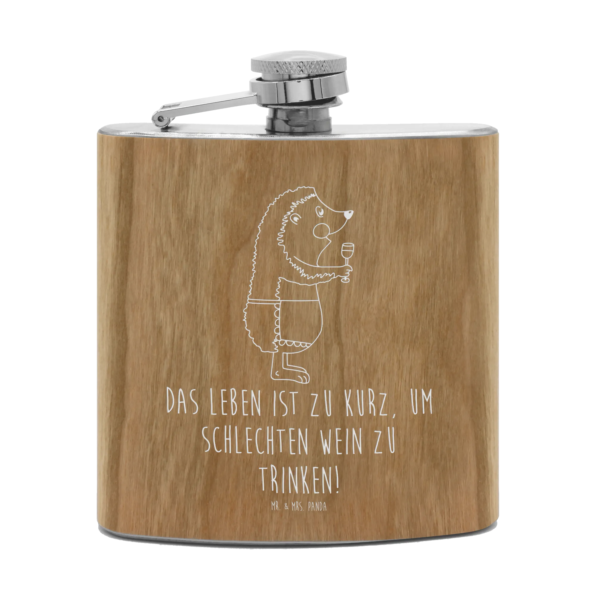 Jedes Detail des Motivs wurde liebevoll von Mrs. Panda handgezeichnet und sorgt dafür, dass jeder Schluck aus diesem Flachmann ein Genuss ist. Der Spruch "Das Leben ist zu kurz, um schlechten Wein zu trinken!" motiviert dazu, das Leben in vollen Zügen zu genießen.