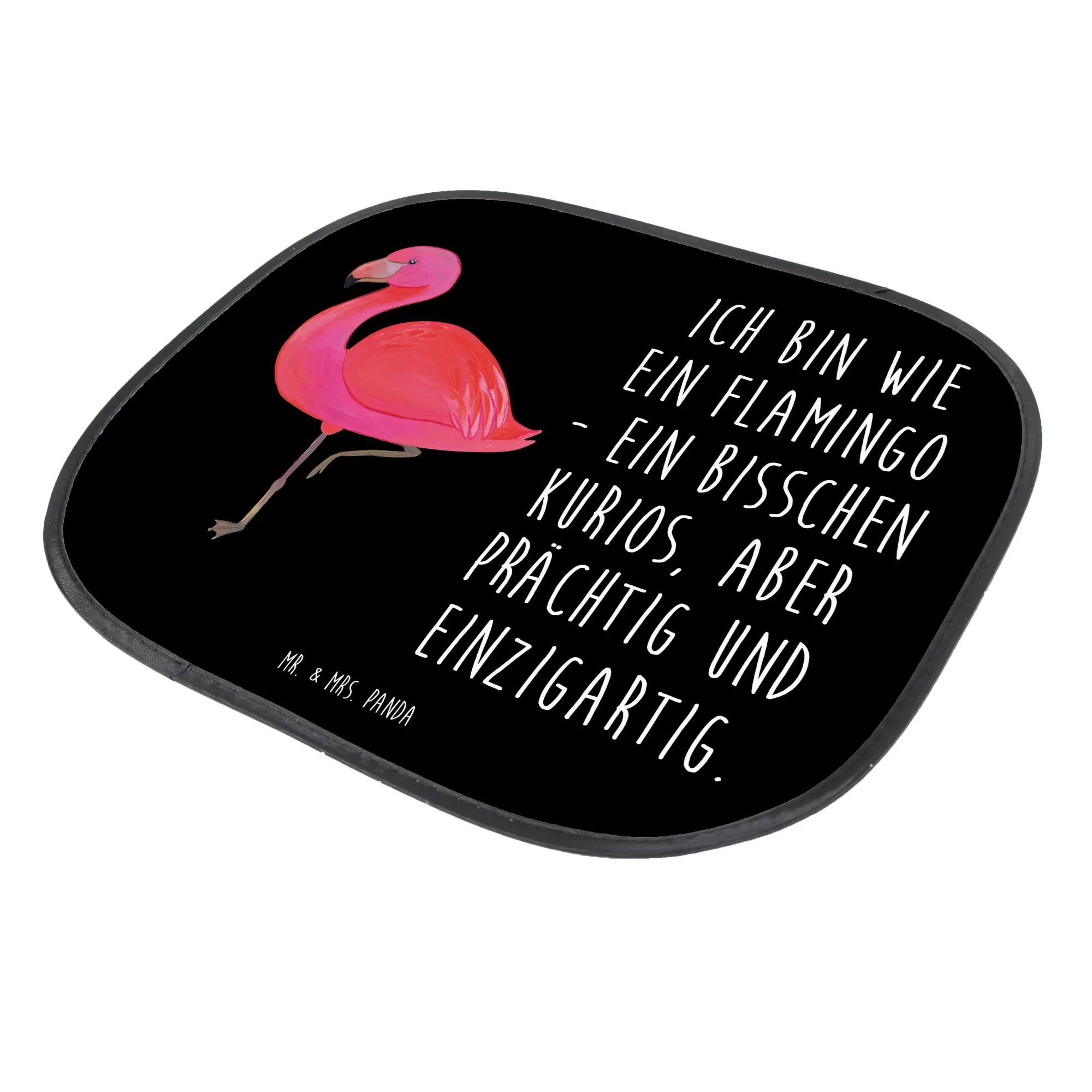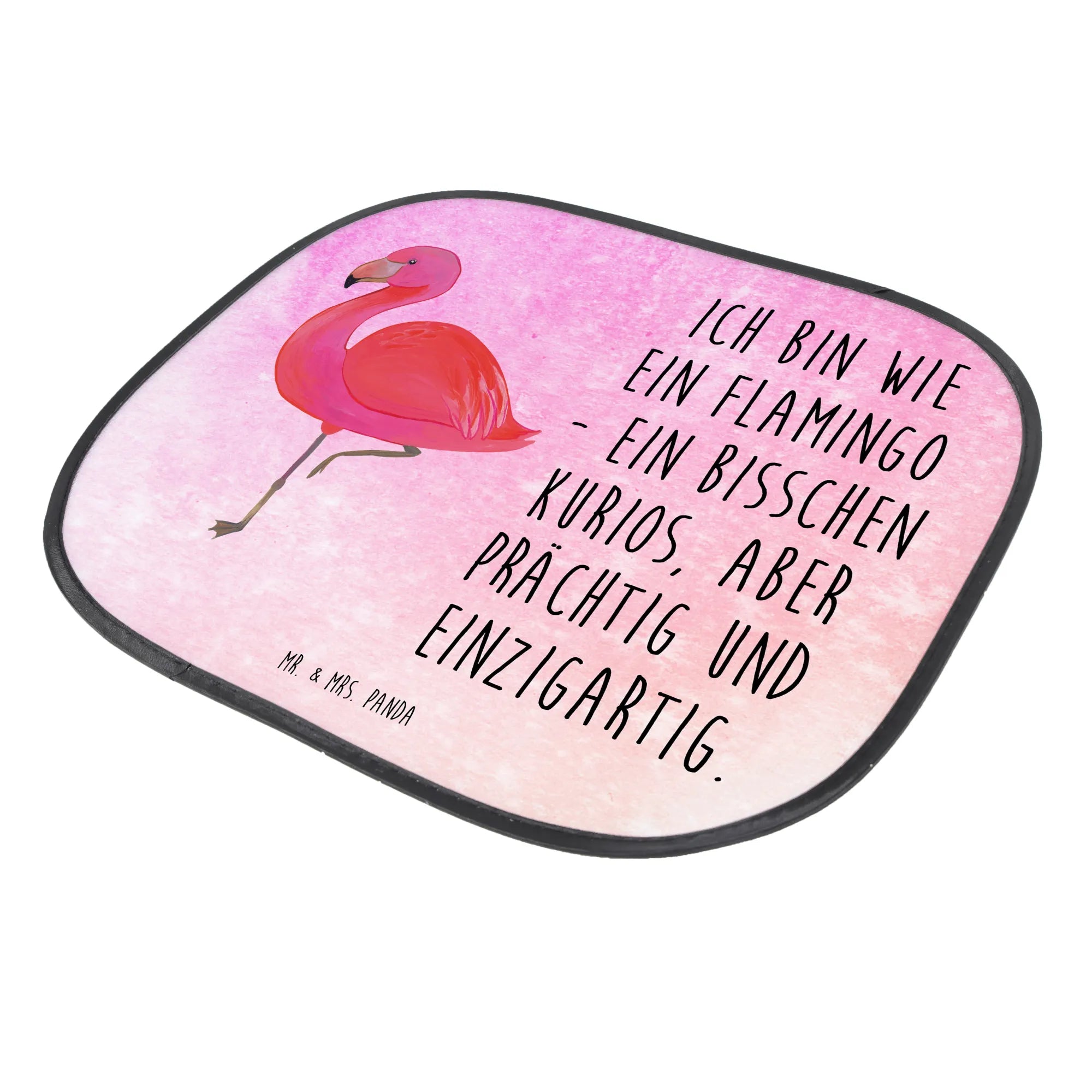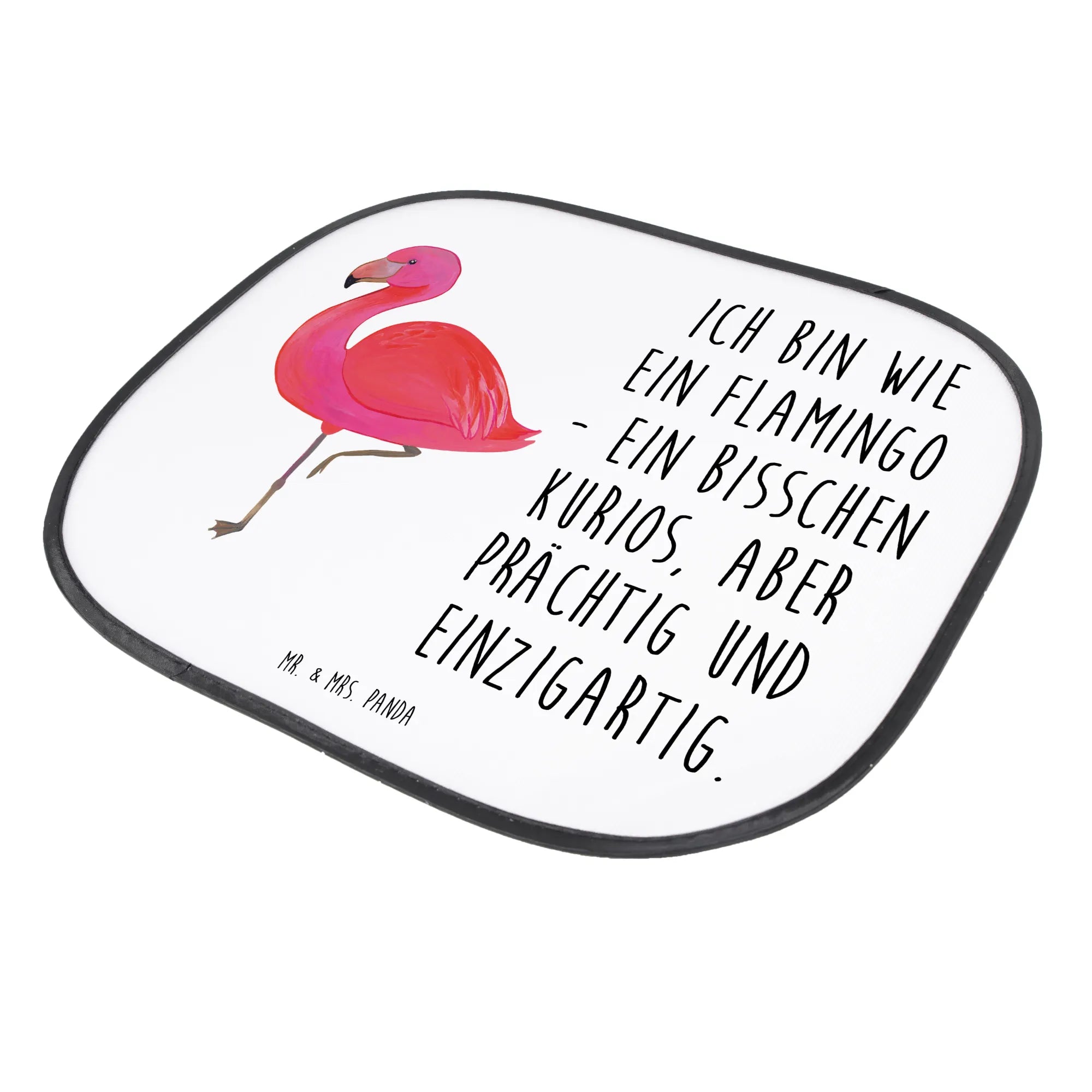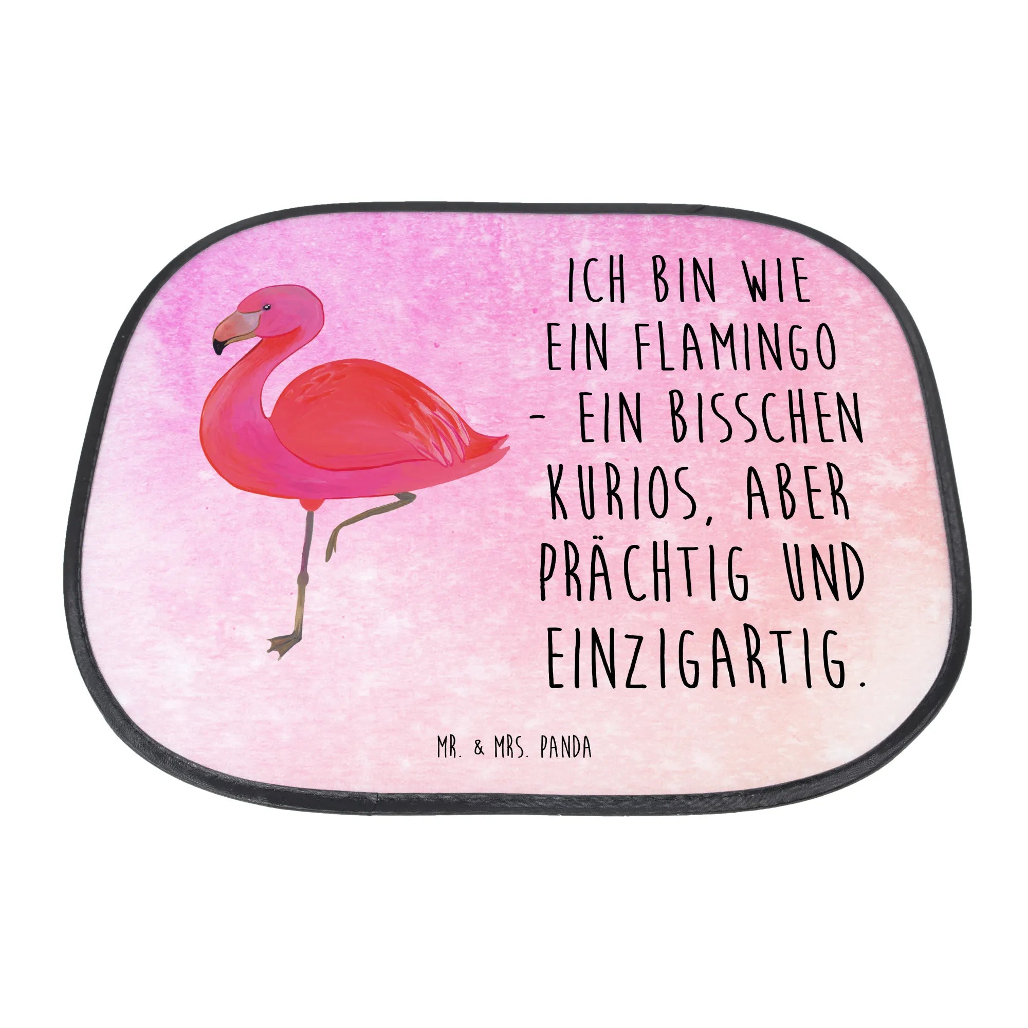 Der Auto Sonnenschutz Flamingo classic von Mr. & Mrs. Panda ist das perfekte Geschenk für alle Sonnenanbeter und Familien mit kleinen Kindern! Wenn du nach einem einzigartigen und funktionalen Sonnenschutz für das Auto suchst, dann ist dieses Produkt genau das Richtige für dich. Mit dem liebevoll handgezeichneten Flamingo-Motiv versprüht dieser Auto Sonnenschutz gute Laune und erinnert uns an Sommer, Sonne, und unbeschwerte Tage. Mit der Aufschrift 'Ich bin wie ein Flamingo - ein bisschen kurios, aber prächtig und einzigartig.' strahlt es zudem eine positive Botschaft aus, die jeden kleinen Reisenden begeistert.