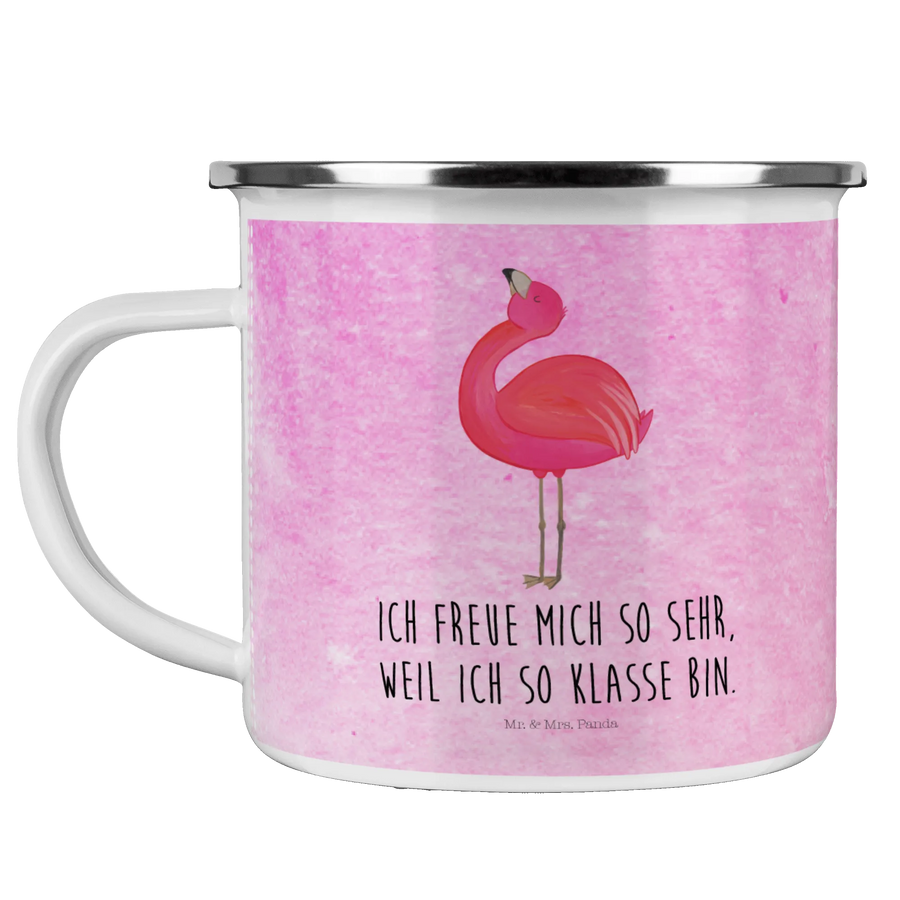 Die Camping Emaille Tasse mit dem stylischen Flamingo-Motiv von Mr. & Mrs. Panda ist das perfekte Geschenk für jeden, der das Abenteuer im Freien liebt! Diese einzigartige Metalltasse, die mit einem entzückenden Flamingo und dem Spruch "Ich freue mich so sehr, weil ich so klasse bin." bedruckt ist, wacht in der Natur zum Leben.