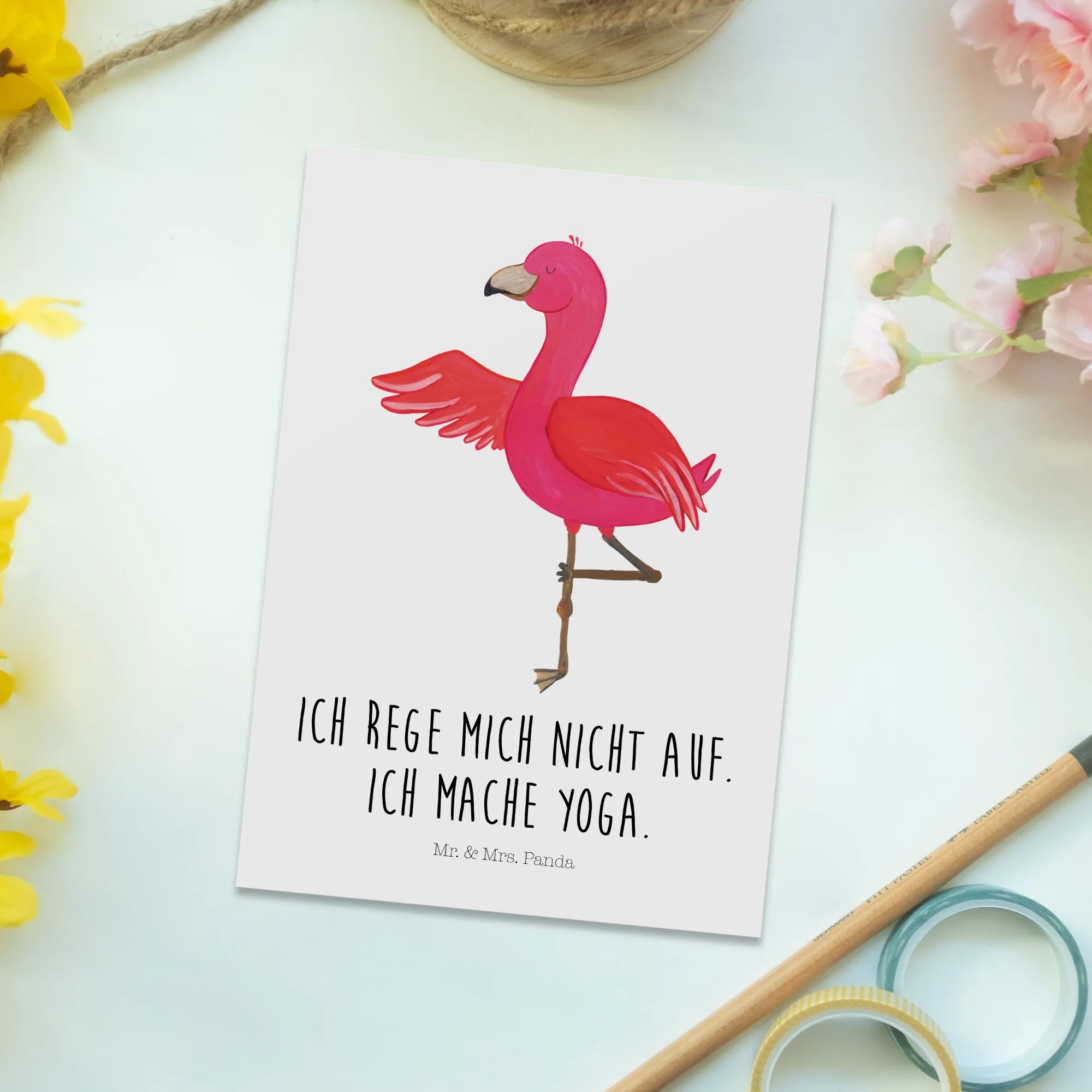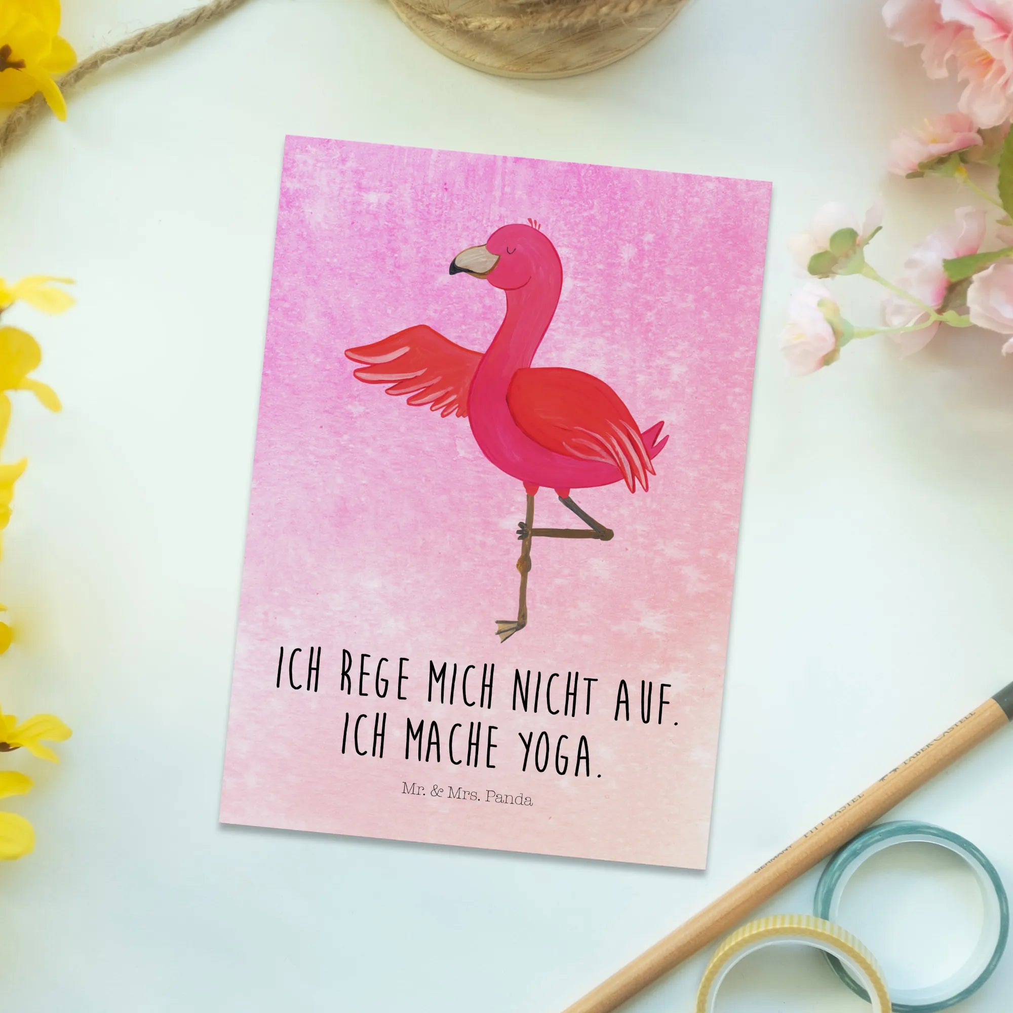 Postkarte Flamingo Yoga – aus der fröhlichen Flamingo - Kollektion von Mr. & Mrs. Panda. Unser liebevoll von Mrs. Panda handgezeichnetes Aquarell zeigt Flamie, den pinken Flamingo, in einer entspannten Yoga-Pose. Mit dem frechen Spruch „Ich rege mich nicht auf. Ich mache Yoga.“ ist diese Karte ein kleines Stück Achtsamkeit zum Verschicken. 😊