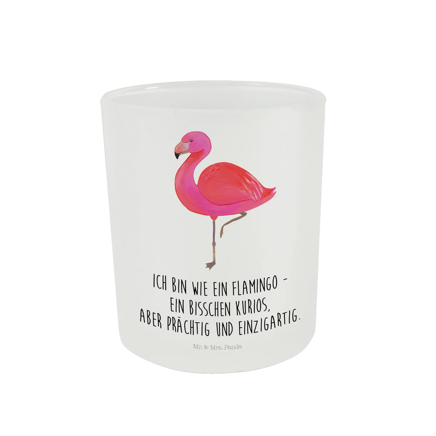 Das traumhafte Windlicht Flamingo classic aus der Flamingo-Kollektion von Mr. & Mrs. Panda ist nicht nur ein schlichtes Deko-Element, sondern ein echtes Highlight für jedes Zuhause. Dieses wundervolle Teelichtglas bringt die Freude des Sommers direkt in Dein Wohnzimmer. Der mit viel Liebe handgezeichnete Flamingo auf dem satinierten Glas lässt Dich sofort an sonnige Tage am Strand denken und schafft mit seinem gemütlichen Kerzenlicht eine einzigartige Atmosphäre. Ob bei einem romantischen Dinner oder einfach zum Entspannen nach einem langen Tag, mit unserem Windlicht sorgst Du für eine einladende Stimmung.