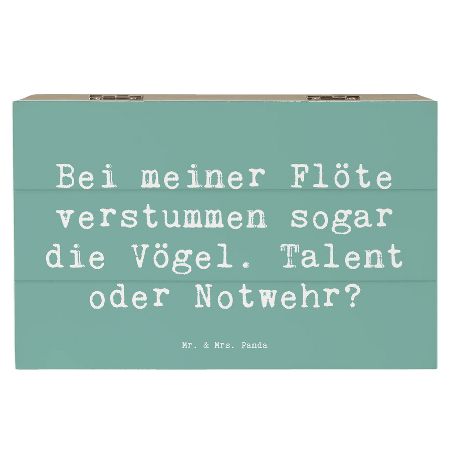 \nDie Holzkiste ist ideal als Aufbewahrungsort für Erinnerungen: Egal ob zur Kommunion, Konfirmation, für Kinderfotos oder als kreative Geschenkbox - diese Kiste lässt die Herzen höher schlagen. Mit ihrem charmanten Motiv bietet sie nicht nur Platz für Erinnerungen, sondern auch ein Stück Lebensfreude. Der Spruch „Bei meiner Flöte verstummen sogar die Vögel. Talent oder Notwehr?“ wird die Herzchen deiner Freunde und Familie im Sturm erobern.