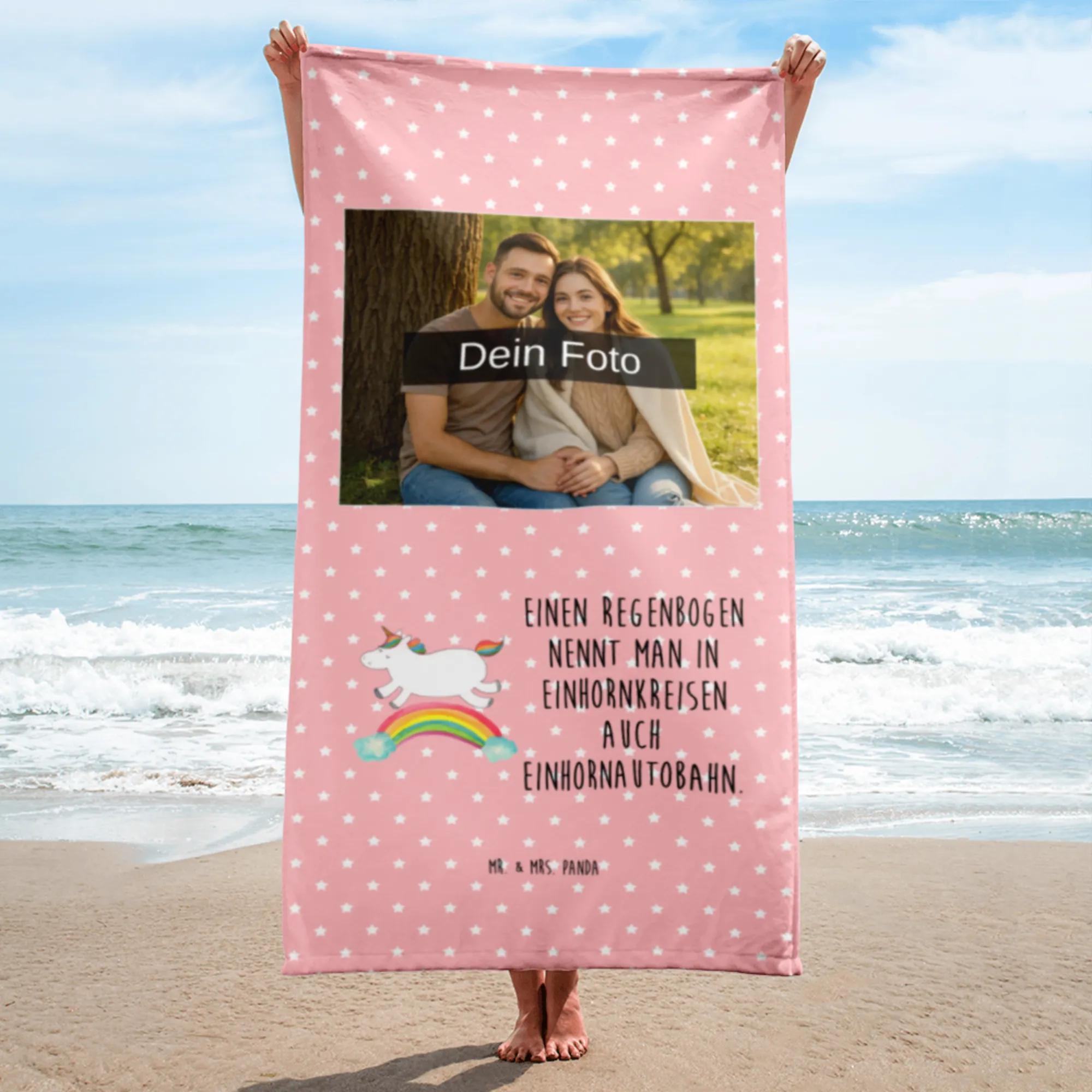 Hol dir das Foto XL Handtuch von Mr. & Mrs. Panda, das nicht nur großartig aussieht, sondern auch super funktional ist. Mit den komfortablen Maßen von 1520 mm x 760 mm und einer weichen Dicke von 7 mm ist es aus wunderbar fluffigem Baumwollfrottee gefertigt. Das Handtuch ist hervorragend geeignet für unvergessliche Tage am Strand oder entspannende Stunden in der Sauna. Umso schöner wird dein Handtuch, wenn du es mit deinem eigenen Foto personalisierst. Vergiss nicht, dass das hochgeladene Bild in einer hohen Auflösung sein sollte, damit das Druckergebnis perfekt wird. Außerdem ist das Handtuch durch seine spezielle Frotteerückseite besonders saugfähig. Das Handtuch lässt sich einfach bei 30°C in der Waschmaschine reinigen – merken und stressfrei nutzen, das ist unser Motto! Lass dir dieses bunte, mit Herz und Stil bedruckte Handtuch nicht entgehen!