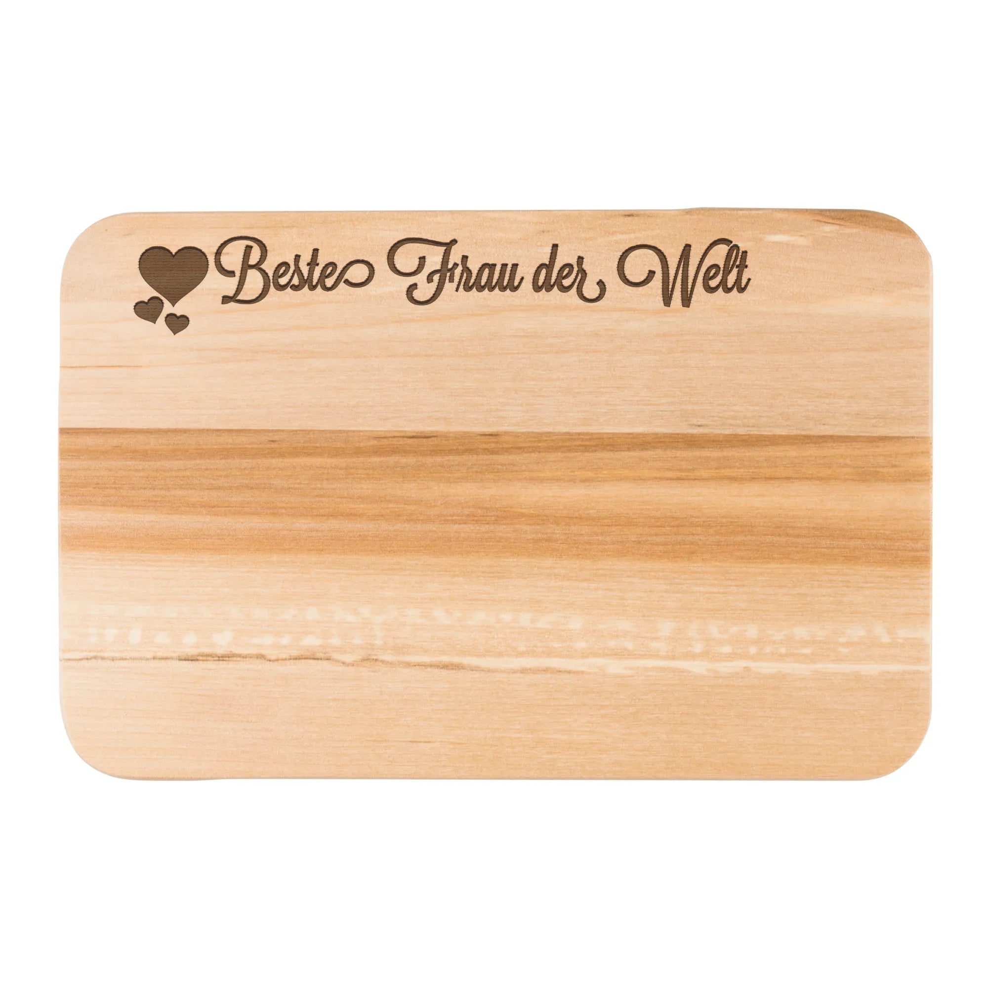 Hergestellt aus robustem Birkenholz, ist es langlebig und pflegeleicht. Die Dimensionen von 130 mm x 230 mm machen es ideal für jede Küche, während die zarte Gravur von floralen Ornamenten und dem liebevollen Schriftzug "Frau" den besonderen Charakter des Brettchens unterstreicht.