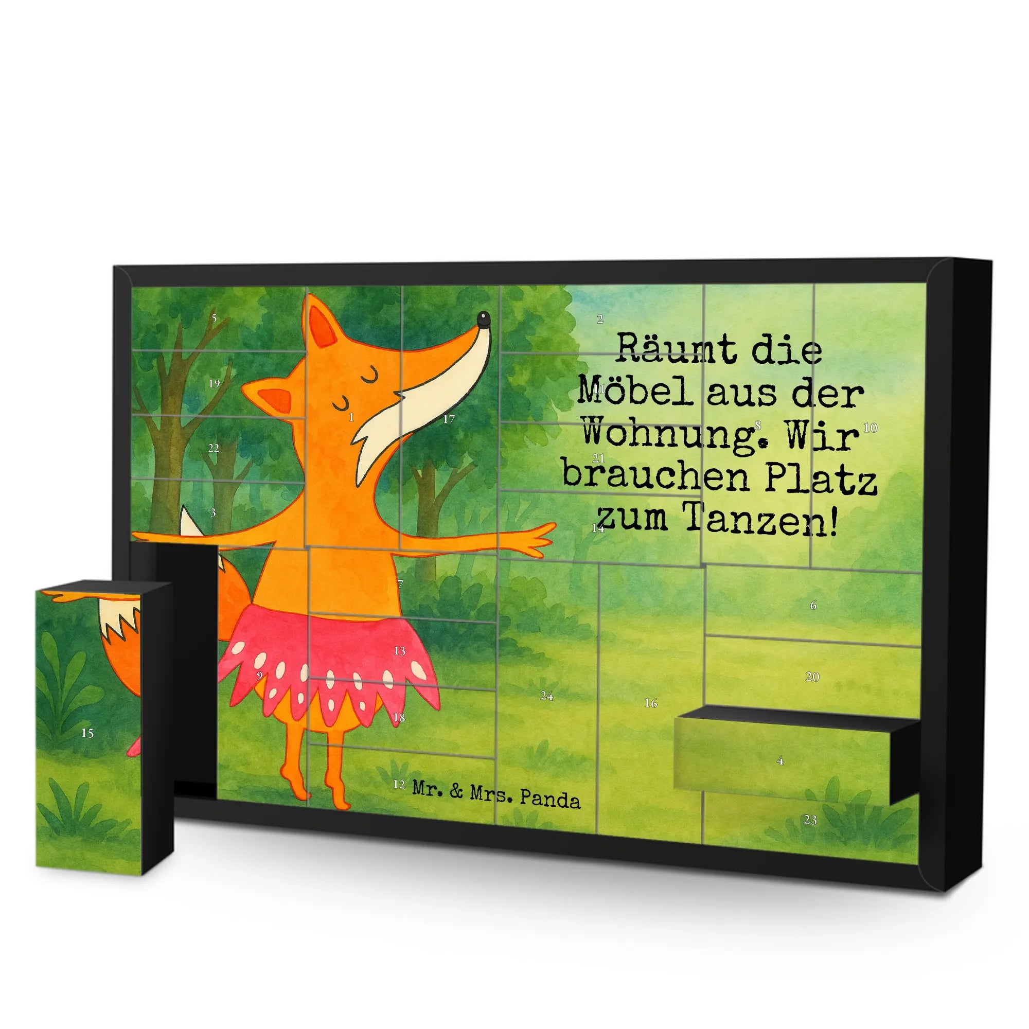 Wunderschöner, befüllbarer Adventskalender von Mr. & Mrs. Panda – perfekt, um die Vorweihnachtszeit ganz persönlich zu gestalten! Dieser liebevoll gestaltete Befüllbarer Adventskalender ist bedruckt mit schönen Sprüchen und zauberhaften Motiven von Mr. & Mrs. Panda. Auf der Frontseite begrüßt dich eine herzliche Zeichnung von Mrs. Panda, die dem Kalender seinen unverwechselbaren Charme verleiht. Der Kalender bietet 24 einzelne Schachteln zum Selbstbefüllen, ideal für kleine Überraschungen, Süßigkeiten oder persönliche Botschaften. Hergestellt aus stabilem Adventskalender Karton, überzeugt er durch brillante Druckqualität mit seidenmatter Oberfläche, die Farben und Details besonders schön zur Geltung bringt. Der Kalender ist nicht personalisierbar und wird ohne Füllung geliefert – so kannst du ihn ganz nach deinen Wünschen befüllen. Die praktische Aufstellvorrichtung sorgt dafür, dass der Kalender sicher und dekorativ steht. Maße: Breite: 619 mm, Höhe: 405 mm, Tiefe: 50 mm. Ob als Geschenk für die Familie, für Freunde oder als hübsche Deko für dein Zuhause – dieser Adventskalender zaubert Vorfreude und ist dabei robust und liebevoll gestaltet. Schenke dir oder deinen Liebsten jeden Tag im Advent ein kleines Lächeln mit diesem charmanten Begleiter von Mr. & Mrs. Panda.