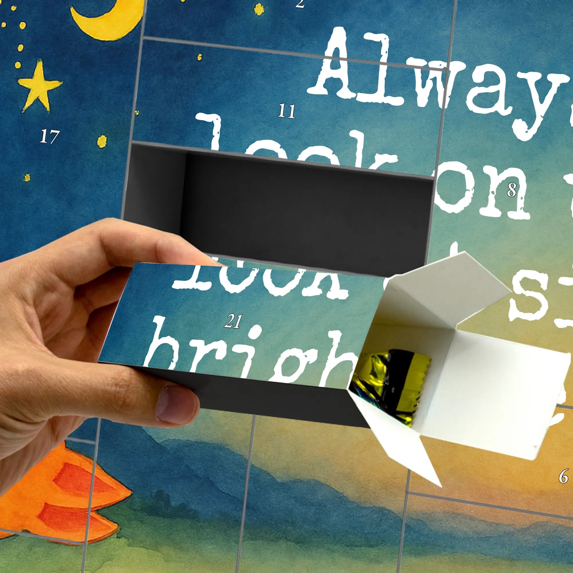 Adventskalender 24 Schachteln – der perfekte Begleiter für die Vorweihnachtszeit von Mr. & Mrs. Panda. Mit seinen 24 Schachteln zum Selbstbefüllen ist dieser Kalender ideal, um jeden Adventstag mit kleinen Überraschungen zu füllen. Die Front ziert eine liebevolle Zeichnung von Mrs. Panda sowie warmherzige Sprüche und Motive, die das Herz erwärmen. Gefertigt aus stabilem Adventskalender Karton besticht der Kalender durch brillante Druckqualität und eine edle, seidenmatte Oberfläche. Die integrierte Aufstellvorrichtung macht das Aufstellen kinderleicht und sorgt für eine sichere Präsentation. Bitte beachten: Der Kalender ist nicht personalisierbar und wird ohne Füllung geliefert, sodass du ihn ganz nach deinen Vorstellungen gestalten kannst. Maße: Breite: 619 mm, Höhe: 405 mm, Tiefe: 50 mm. Ob als Geschenk für die Liebsten oder als nette Familien-Tradition – dieser Adventskalender mit 24 Schachteln bringt jeden Morgen ein kleines Stück Weihnachtsfreude.