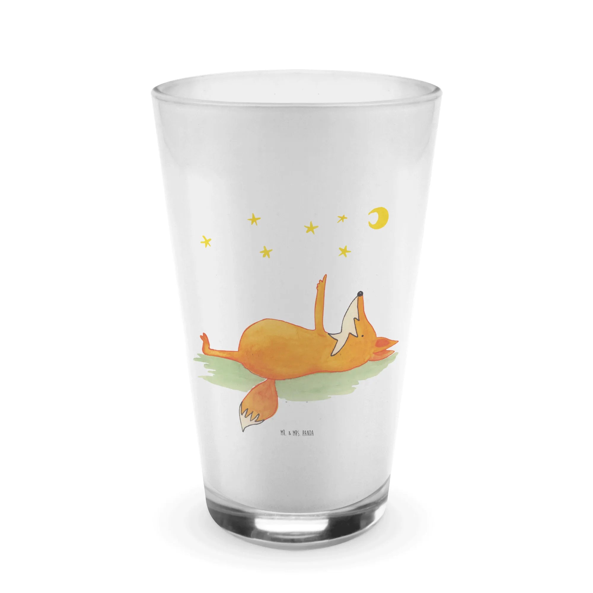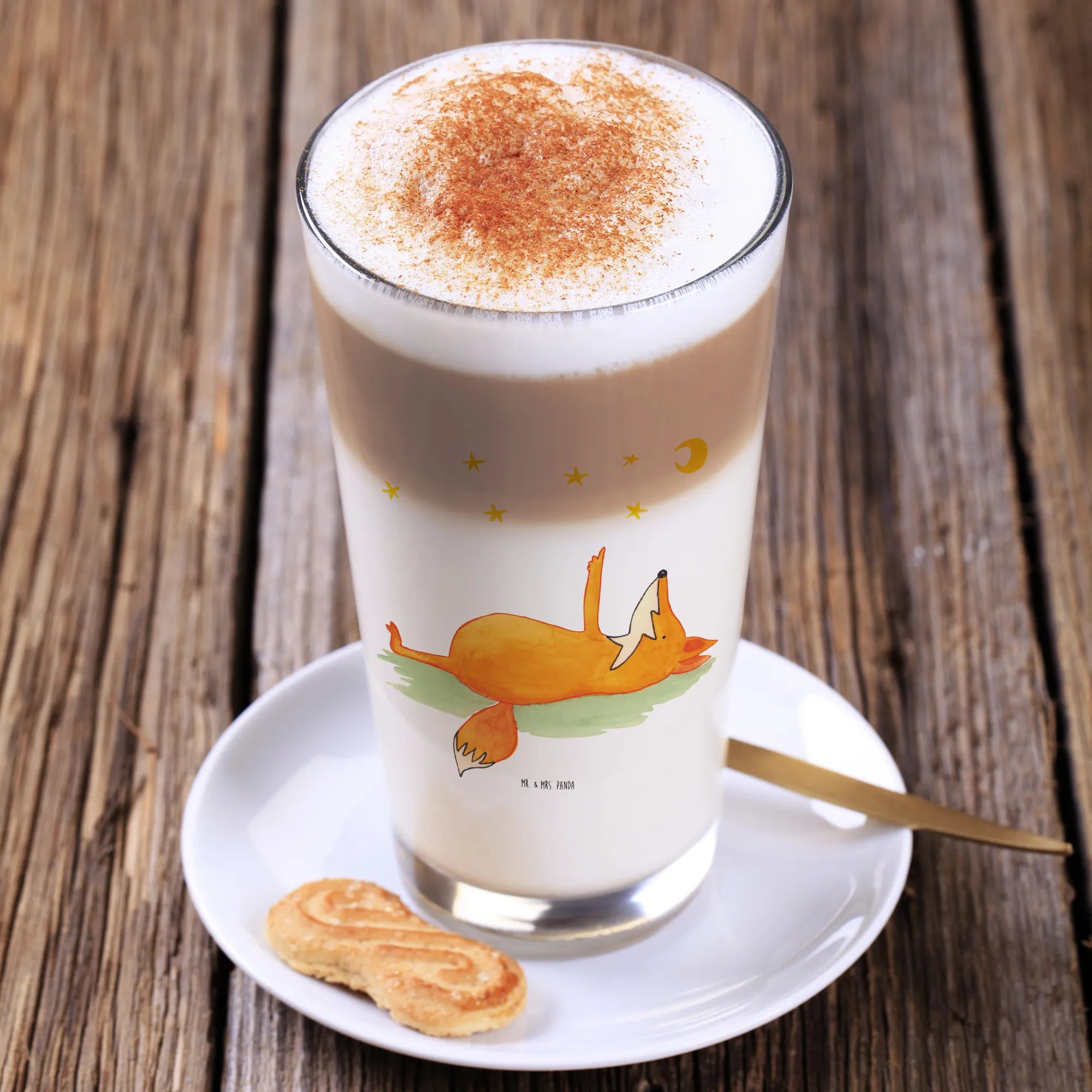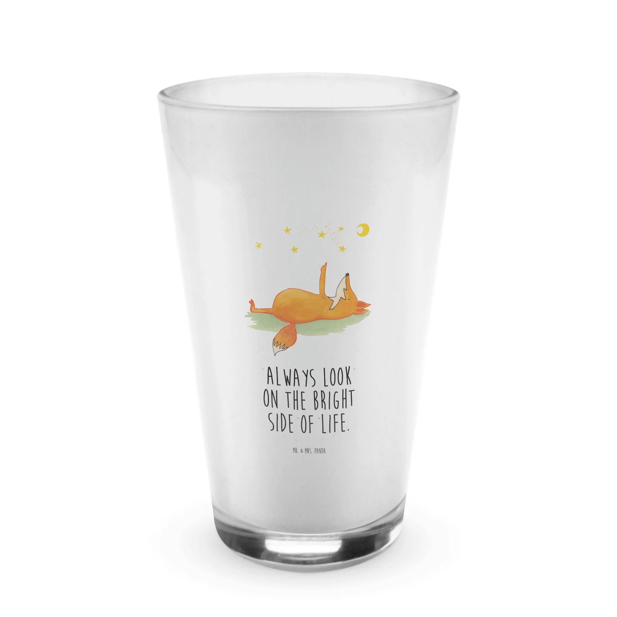 Entdecke unser wunderschönes Cappuccino Glas mit dem bezaubernden Motiv "Fuchs Sterne" aus der beliebten Fuchs Kollektion von Mr. & Mrs. Panda. Dieses edle Glas ist nicht nur ein praktischer Begleiter für Deine Kaffeemomente, sondern auch ein wahres Schmuckstück für jeden, der die Sterne liebt. Der süße Fuchs, der auf dem Rücken liegt und voller Staunen in den Sternenhimmel schaut, lädt Dich ein, einen Moment innezuhalten und das Leben von seiner schönsten Seite zu betrachten. Der Spruch "Always look on the bright side of life" ist nicht nur inspirierend, sondern wird auch die Herzen Deiner Freunde und Familie mit Freude erfüllen.