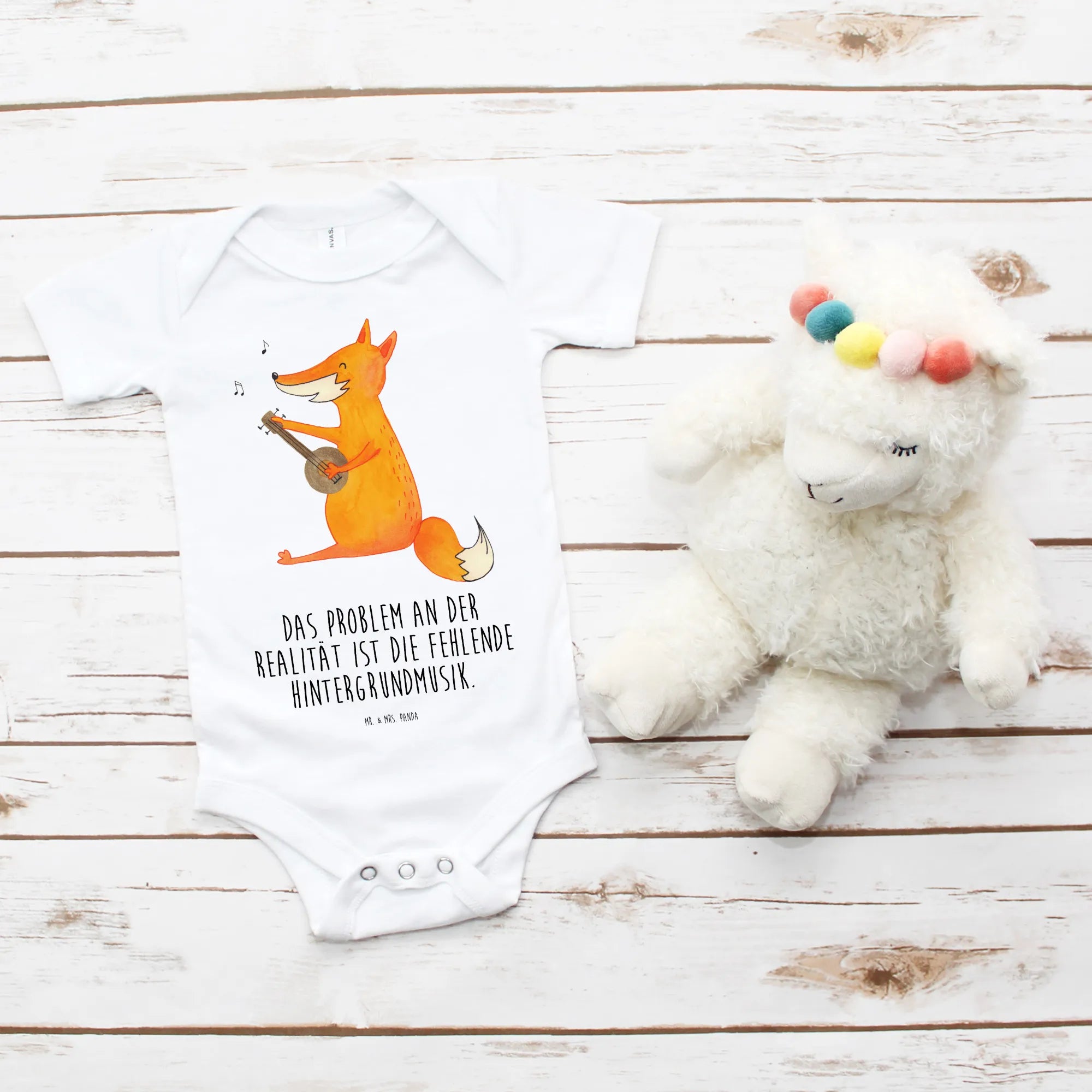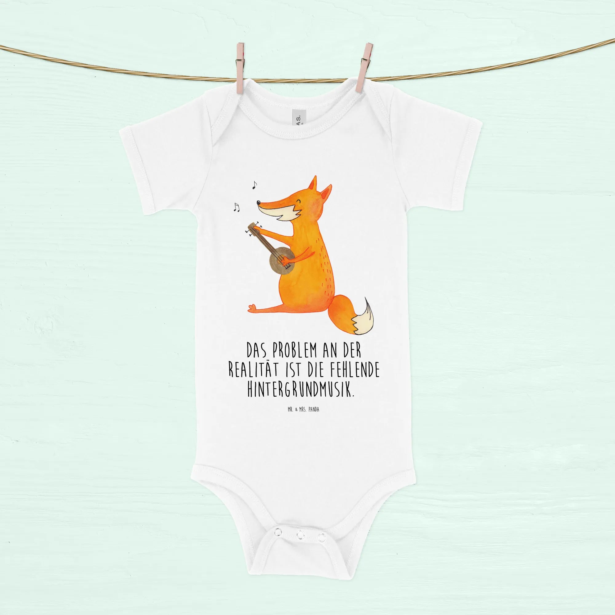 Ob als Geschenk zur Geburt, zur Babyparty oder als liebevolle Überraschung zum ersten Geburtstag, dieser Babystrampler zaubert jedem ein Lächeln ins Gesicht! Der Fuchs mit seiner Gitarre spielt sein schönstes Lied und verkörpert die Freude an der Musik sowie die Kreativität, die in jedem kleinen Herzen steckt. Der Spruch 'Das Problem an der Realität ist die fehlende Hintergrundmusik' bringt es auf den Punkt und macht diesen Body zu einem speziellen Highlight in der Erstausstattung deines Babys.