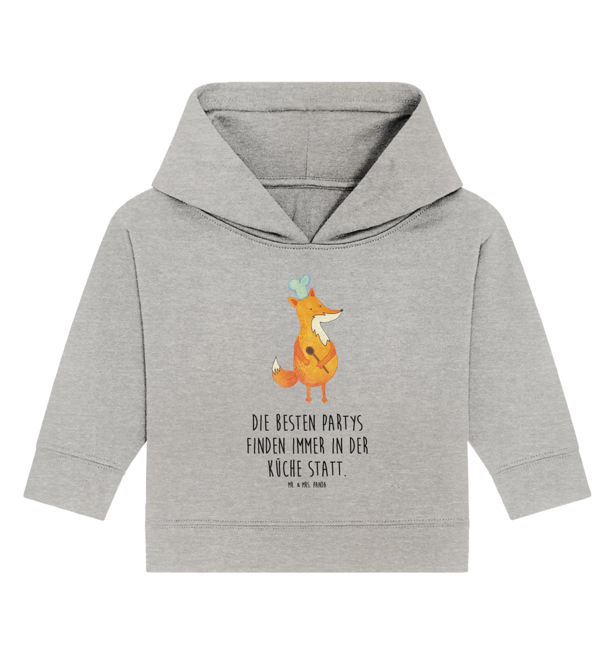 Entdecke das zauberhafte Organic Baby Hoodie mit dem witzigen Motiv "Fuchs Koch" aus der beliebten Fuchs Kollektion von Mr. & Mrs. Panda! Dieses kuschelige Baby Kapuzensweatshirt in einem warmen, erdigen Heather Grey ist nicht nur super gemütlich, sondern auch ein echter Eyecatcher.