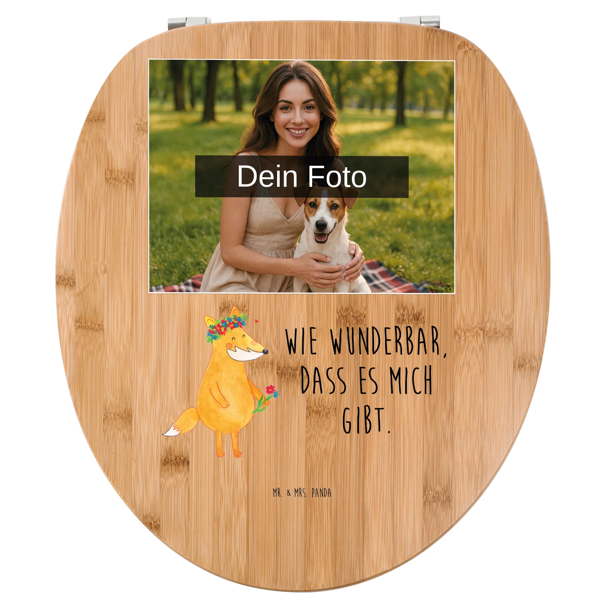 Mache dein Badezimmer zu einem Ort voller Freude mit unserem personalisierten Foto WC Sitz Motiv von Mr. & Mrs. Panda! Dieses einzigartige Möbelstück misst 430 mm x 370 mm x 50 mm und ist entweder aus edlem Bambus Holz (braun) oder praktischem MDF Holz (weiß) erhältlich. Der Sitz wird mit bezaubernden Motiven und fröhlichen Sprüchen bedruckt, die dein Bad in einen fröhlichen Raum verwandeln. Aber das Beste daran? Du kannst ihn mit deinem persönlichen Wunschfoto gestalten! Denk daran, dass das hochgeladene Bild in guter Auflösung sein sollte, damit alles optimal zur Geltung kommt. Dieser WC Sitz passt auf jede Euro-WC-Becken und wird mit sämtlichem Befestigungsmaterial geliefert. Er ist nicht nur angenehm und wärmespeichernd, sondern lässt sich auch einfach reinigen – ein feuchtes Tuch und milde Seife genügen! Mit dem langlebigen UV-Druck bleibt dein persönliches Motiv auch viele Jahre strahlend schön. Hol dir diesen einmaligen Toilettensitz und bringe gute Laune ins Bad!
