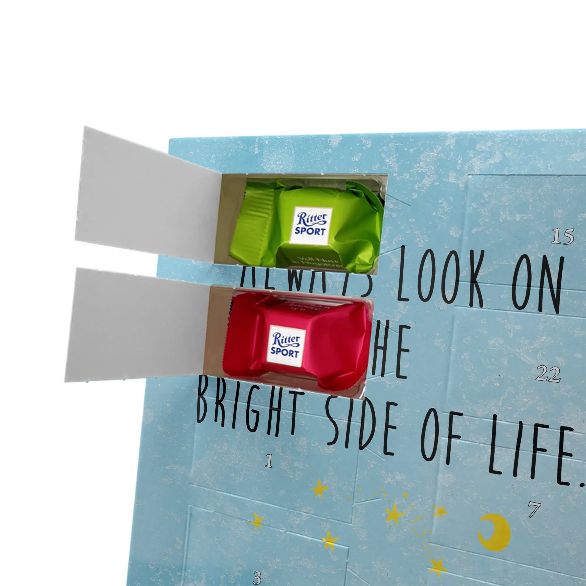 Schoko Foto Adventskalender personalisiert – ein fröhlicher Hingucker von Mr. & Mrs. Panda, der Adventszeit und Erinnerungen verbindet. Der Kalender ist bedruckt mit zauberhaften Motiven & Sprüchen von Mr. & Mrs. Panda und lässt sich ganz leicht mit einem Foto deiner Wahl personalisieren. Achtung Bildqualität: Für ein scharfes Druckbild solltest du ein Foto in hoher Auflösung verwenden. Kontrolliere den Bildausschnitt, damit wichtige Gesichter oder Details nicht verloren gehen. Verwende nur Fotos, für die du die Rechte besitzt oder die frei nutzbar sind. Bitte beachte: Die Fotos werden weder nachbearbeitet noch zugeschnitten und personalisierte Foto Artikel sind vom Umtausch ausgeschlossen. Die Verarbeitung überzeugt mit seidenmatter Oberflächenveredelung und bedruckten Seitenflächen für ein edles Finish. Maße: 325 mm x 225 mm x 27 mm. Besonderheit: Du kannst den Kalender aufhängen oder aufstellen – ganz flexibel. Gefüllt ist der Kalender mit Ritter Sport Schokowürfeln in leckeren Geschmacksrichtungen wie Mousse au Chocolat, Schoko Crisp, Voll-Nuss in Nougatcreme, Karamell Duo, Joghurt und Erdbeer-Joghurt. Ein liebevolles Geschenk, das jeden Tag im Advent versüßt.