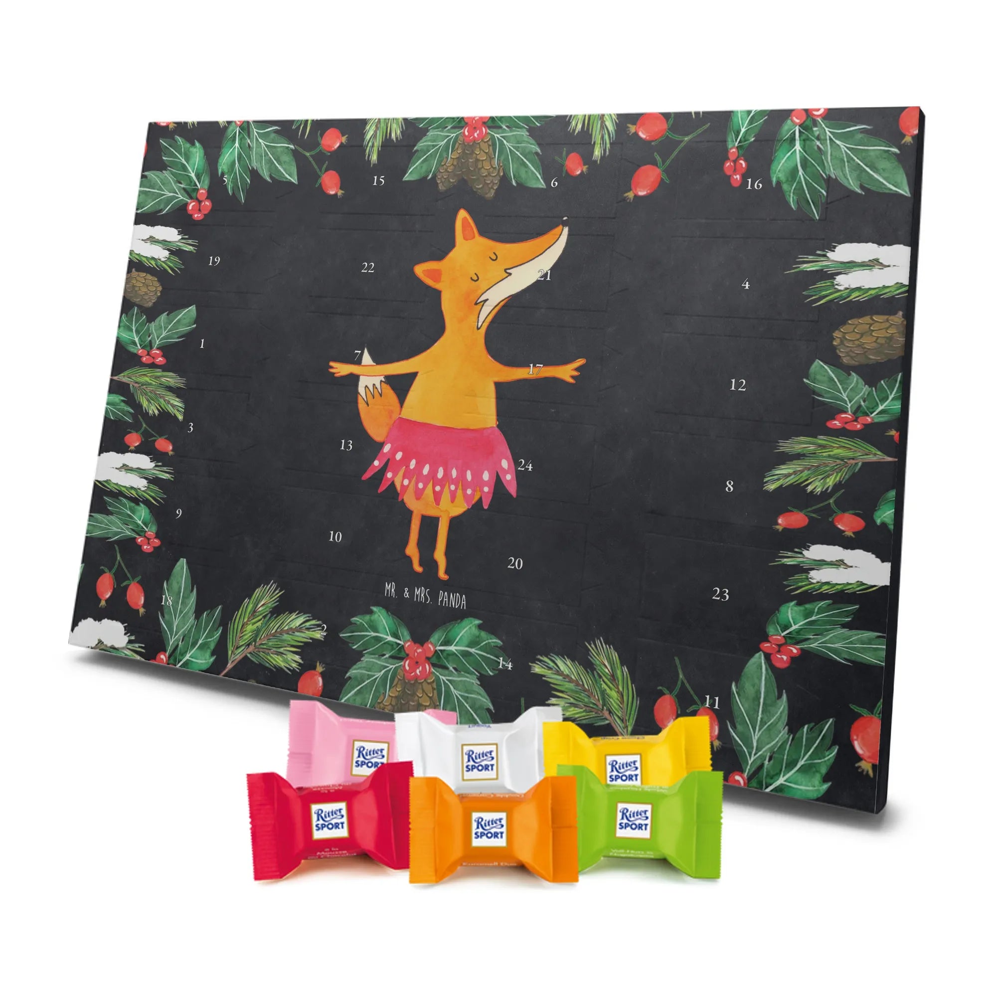 Unser entzückender Schokoladen Adventskalender von Mr. & Mrs. Panda ist das perfekte Highlight für die Adventszeit. Bedruckt mit wunderschönen Motiven & Sprüchen von Mr. & Mrs. Panda zaubert er dir ein Lächeln an jedem Tag im Dezember. Der Kalender ist nicht personalisierbar, überzeugt aber durch brillante Druckqualität mit seidenmatter Oberflächenveredelung und sorgsame bedruckte Seitenflächen. Die stabile Verarbeitung macht ihn zu einem dekorativen Hingucker. Maße: 325 mm x 225 mm x 27 mm. Besonders praktisch: Er kann aufgehängt oder aufgestellt werden, ganz nach deinem Geschmack und Platzangebot. Gefüllt ist der Adventskalender mit Ritter Sport Schokowürfeln – in verführerischen Sorten wie Mousse au Chocolat, Schoko Crisp, Voll-Nuss in Nougatcreme, Karamell Duo, Joghurt und Erdbeer-Joghurt. Wichtiger Hinweis: Es handelt sich um einen Kalender gefüllt mit Ritter Sport Schokolade, nicht um einen Kalender der Marke Ritter Sport. Schenk ihn Freunden, der Familie oder gönn dir selbst eine süße Vorfreude: kleine Schokoladenmomente, liebevoll verpackt von Mr. & Mrs. Panda.