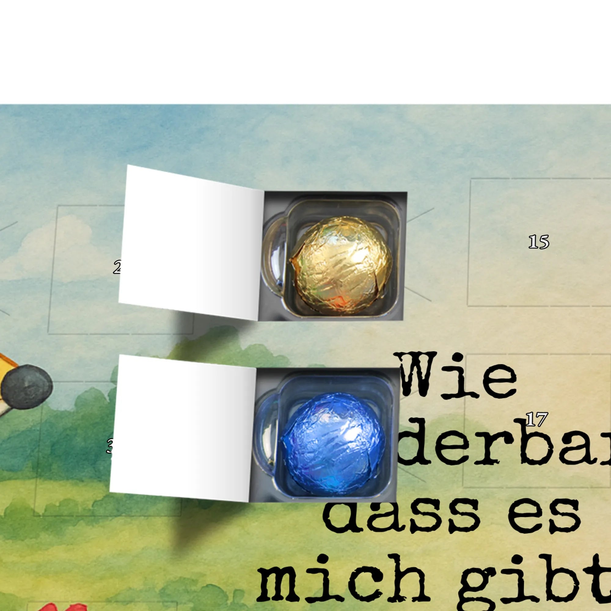 Wunderschöner Schokoladen-Adventskalender von Mr. & Mrs. Panda – süßes Design trifft hochwertige Verarbeitung. Unser Schokoladen-Adventskalender ist bedruckt mit wunderschönen Motiven & Sprüchen von Mr. & Mrs. Panda und nicht personalisierbar, dafür aber mit liebevollen Details gestaltet. Die brillante Druckqualität mit seidenmatter Oberflächenveredelung verleiht dem Kalender ein edles Finish, und auch die Seitenflächen sind bedruckt für einen rundum stimmigen Look. Maße: 233 mm x 178 mm x 24 mm. Die Konstruktion erlaubt sowohl das Aufstellen als auch das Aufhängen – Besonderheit: kann aufgehängt oder aufgestellt werden. Gefüllt mit MARKENNAMEN Schokolade und mit leckeren Schokoladenkugeln bestückt, ist jeder Dezembertag eine kleine Belohnung. Bitte lies die besonderen Hinweise: (Kann Spuren von Haselnüssen, Mandeln, Gluten und Soja enthalten!), kühl und trocken lagern. Ideal als Geschenk, Adventsdekoration oder süße Überraschung für Freunde und Familie. Mr. & Mrs. Panda wünscht dir eine gemütliche und genussvolle Adventszeit!