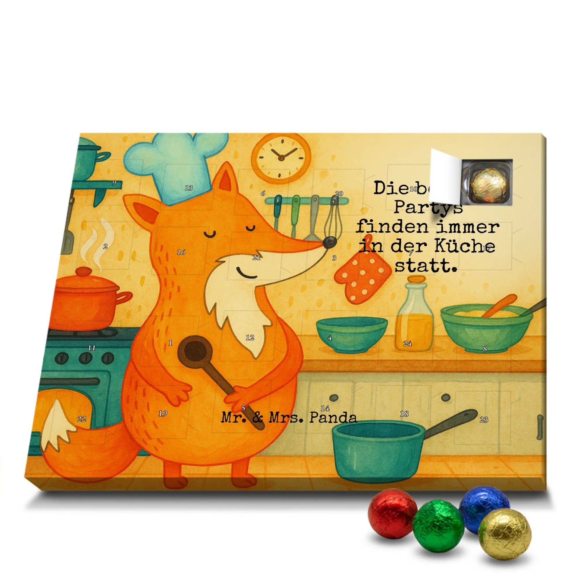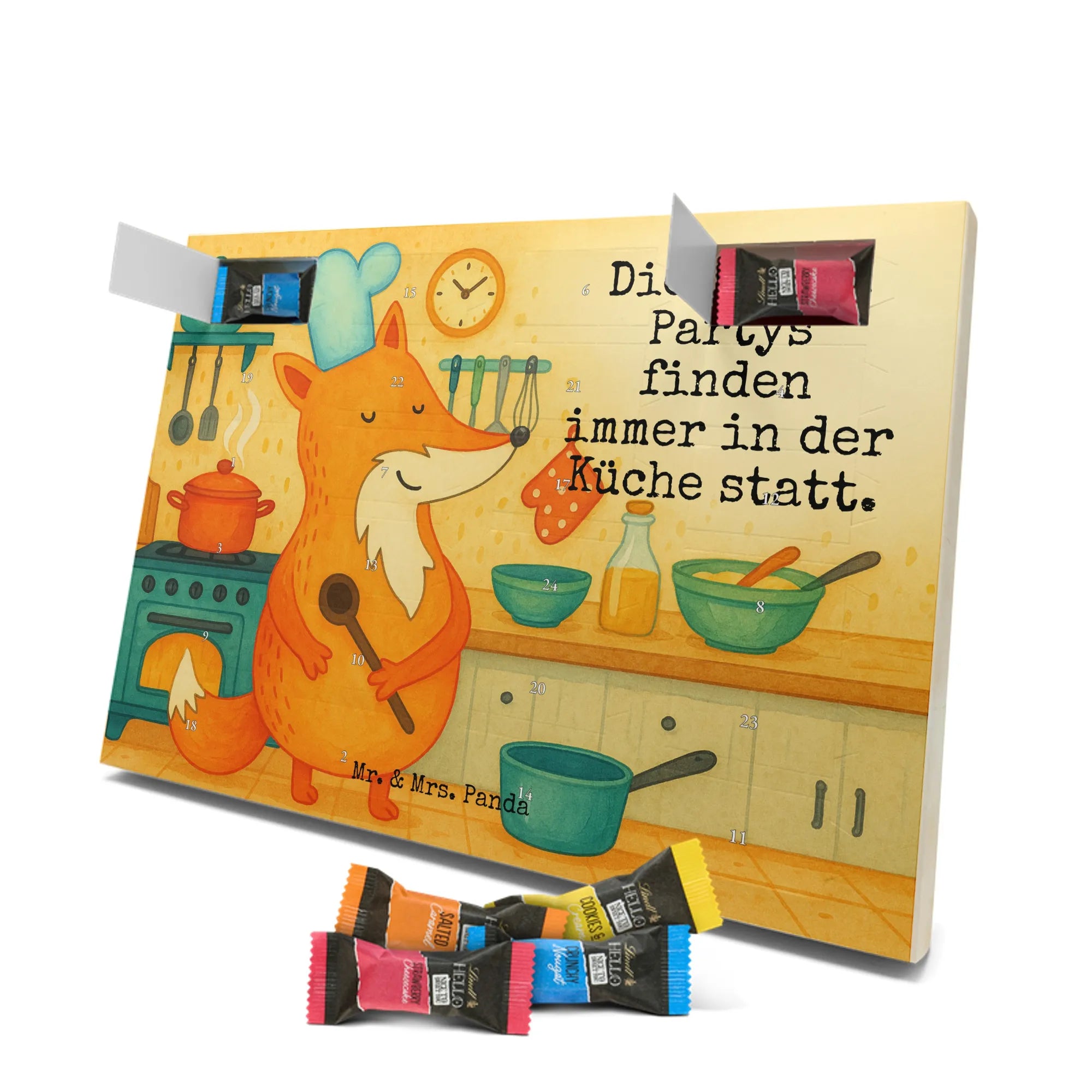 Unser entzückender Schokoladen Adventskalender von Mr. & Mrs. Panda ist das perfekte Highlight für die Adventszeit. Bedruckt mit wunderschönen Motiven & Sprüchen von Mr. & Mrs. Panda zaubert er dir ein Lächeln an jedem Tag im Dezember. Der Kalender ist nicht personalisierbar, überzeugt aber durch brillante Druckqualität mit seidenmatter Oberflächenveredelung und sorgsame bedruckte Seitenflächen. Die stabile Verarbeitung macht ihn zu einem dekorativen Hingucker. Maße: 325 mm x 225 mm x 27 mm. Besonders praktisch: Er kann aufgehängt oder aufgestellt werden, ganz nach deinem Geschmack und Platzangebot. Gefüllt ist der Adventskalender mit Ritter Sport Schokowürfeln – in verführerischen Sorten wie Mousse au Chocolat, Schoko Crisp, Voll-Nuss in Nougatcreme, Karamell Duo, Joghurt und Erdbeer-Joghurt. Wichtiger Hinweis: Es handelt sich um einen Kalender gefüllt mit Ritter Sport Schokolade, nicht um einen Kalender der Marke Ritter Sport. Schenk ihn Freunden, der Familie oder gönn dir selbst eine süße Vorfreude: kleine Schokoladenmomente, liebevoll verpackt von Mr. & Mrs. Panda.