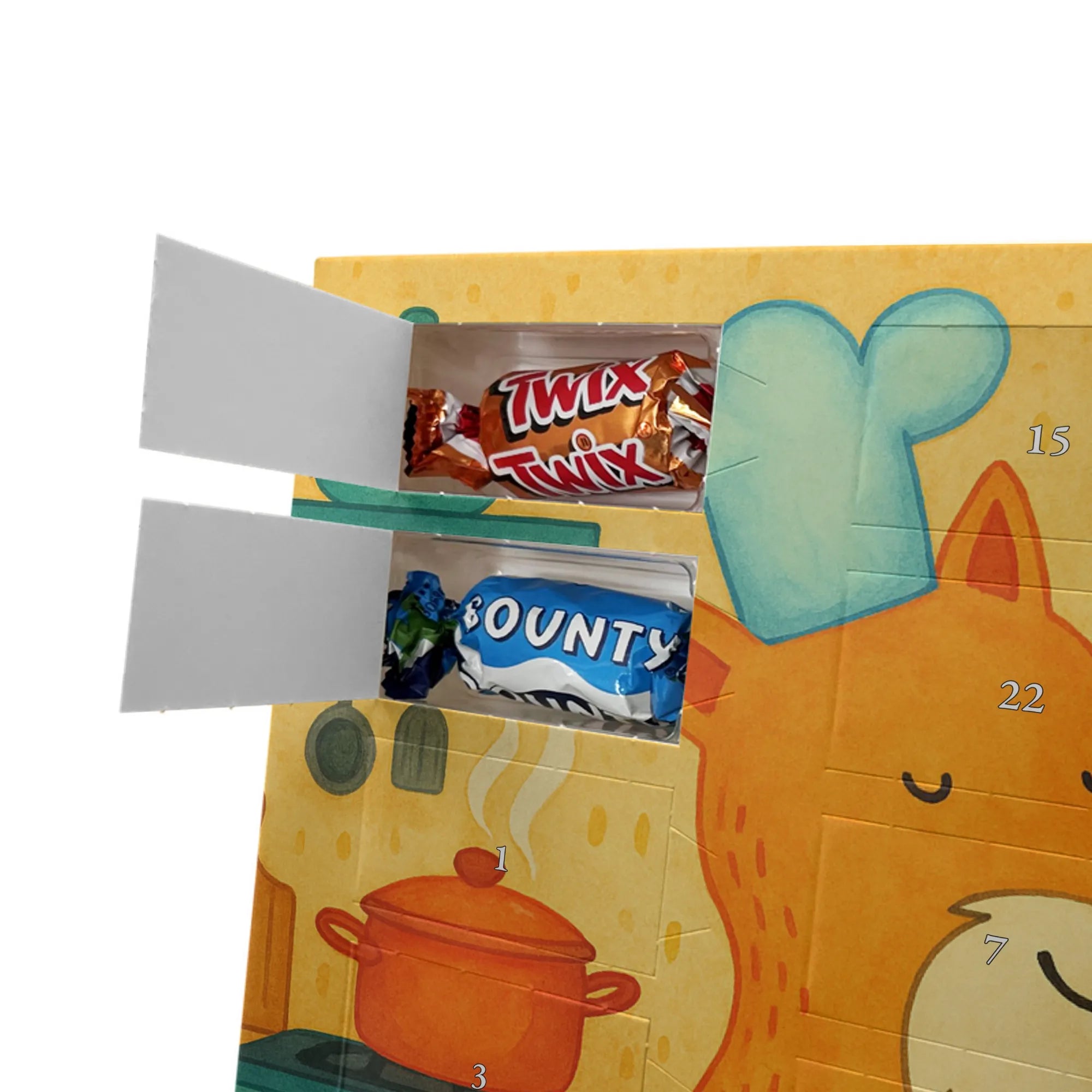 Unser Schoko Adventskalender von Mr. & Mrs. Panda bringt dir und deinen Lieben jede Menge Vorfreude und zauberhafte Momente in die Adventszeit. Der Kalender ist liebevoll bedruckt mit wunderschönen Motiven und frechen Sprüchen im typischen Mr. & Mrs. Panda Stil – ein echter Blickfang auf dem Tisch oder an der Wand. Die brillante Druckqualität kombiniert mit einer seidenmatten Oberflächenveredelung sorgt für edle Farben und ein angenehmes Gefühl beim Anfassen. Auch die Seitenflächen sind bedruckt, sodass der Kalender von allen Seiten hübsch aussieht. Er ist nicht personalisierbar, dafür aber in seiner Gestaltung rundum stimmig. Gefüllt ist der Adventskalender mit 24 hochwertigen Celebrations-Füllungen in acht verschiedenen Sorten: Maltesers, Mars, Snickers, Twix, Milky Way, Bounty, Galaxy und Galaxy Caramel — so ist für jede Naschkatze etwas dabei. Die Besonderheit: Du kannst den Kalender entweder aufstellen oder dank rückseitiger Aufhängung an die Wand hängen. Maße: 325 mm x 225 mm x 27 mm. Ein liebevolles Geschenk für Familie, Freunde oder einfach für dich selbst, das kleine tägliche Glücksmomente schenkt und die Adventszeit versüßt.