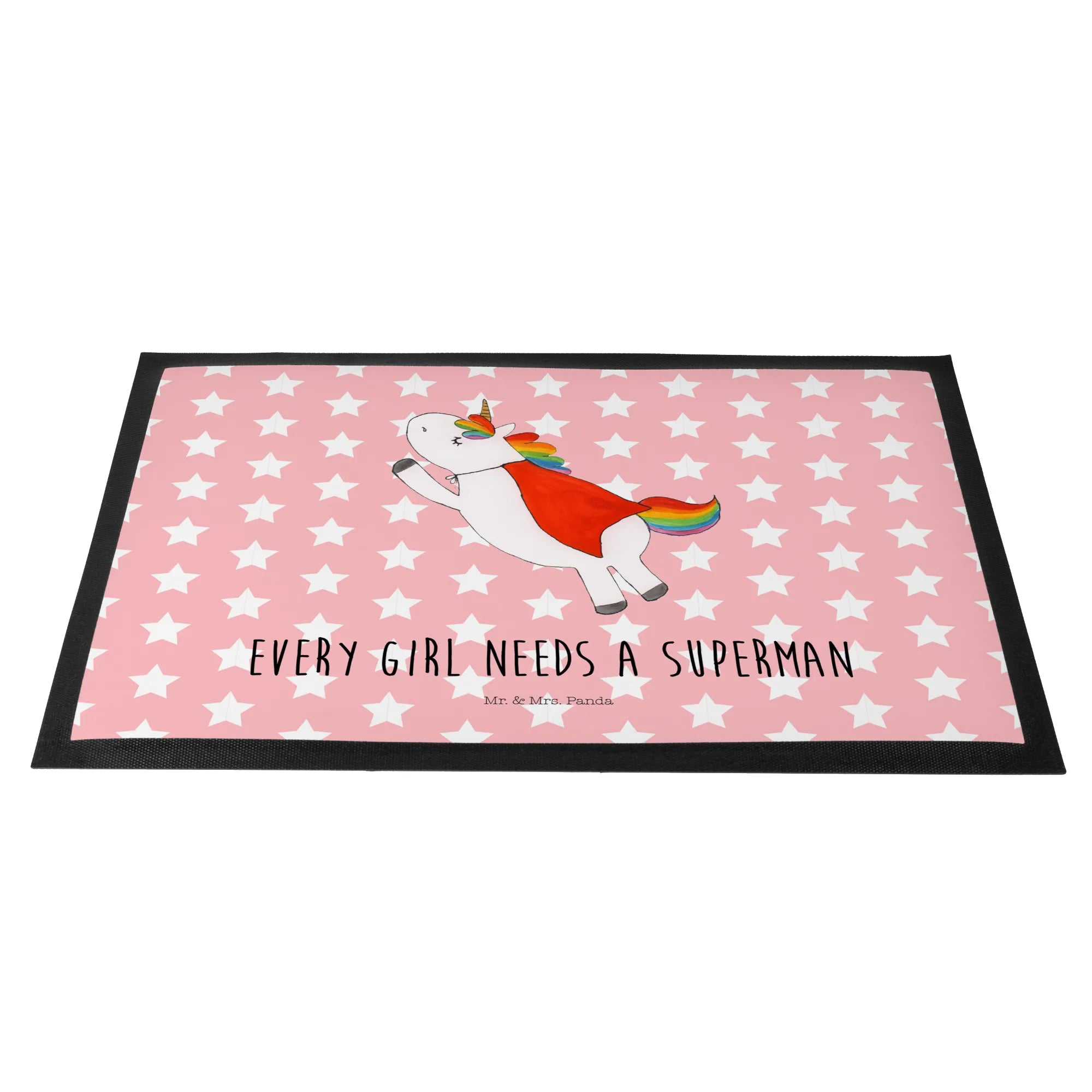 Entdecke die zauberhafte Fußmatte Einhorn Super von Mr. & Mrs. Panda! Diese wunderschöne und funktionale Schmutzmatte ist mehr als nur ein praktischer Helfer im Eingangsbereich - sie bringt auch ein Lächeln in dein Leben!