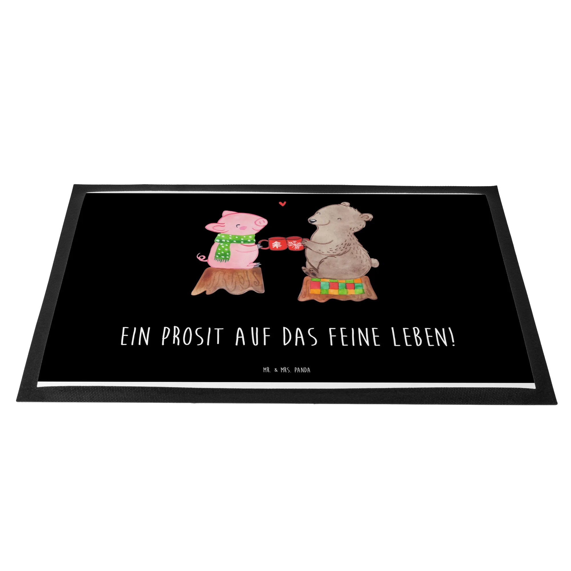 Möchtest Du die Weihnachtszeit auf eine besondere Art und Weise feiern? Dann ist die Fußmatte "Glühschwein Sause" aus der Mr. & Mrs. Panda Winter Kollektion genau das Richtige für Dich! Dieses liebevolle Motiv zeigt ein niedliches Schweinchen mit einem Schal und einen Bären, die auf einem Baumstumpf sitzen und herzlich mit einer Tasse anstoßen. Ein kleines Herzchen verbindet die beiden und bringt eine warme Botschaft der Freundschaft und des Feierns.