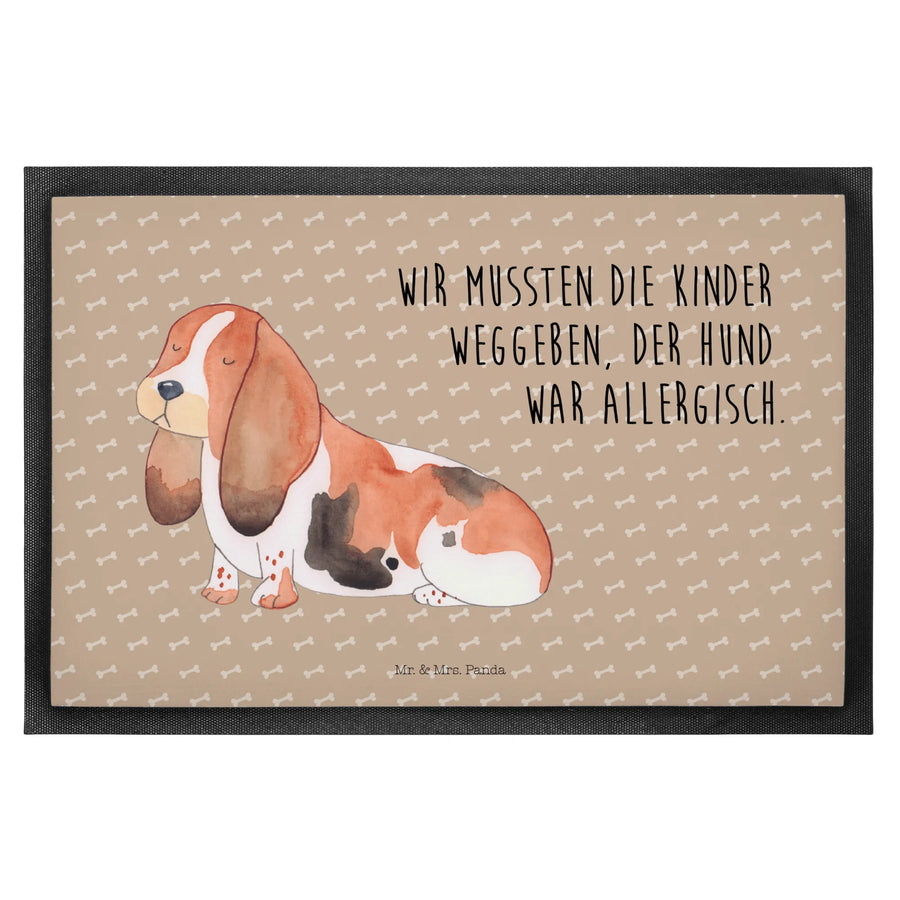 Die Fußmatte mit dem süßen Basset Hound Motiv von Mr. & Mrs. Panda ist nicht nur einfach ein Fußabstreifer, sondern das perfekte Geschenk für alle Hundeliebhaber. Mit dem charmanten Spruch "Wir mussten die Kinder weggeben. Der Hund war allergisch." bringt diese Schmutzmatte garantiert ein Schmunzeln auf die Gesichter deiner Gäste.