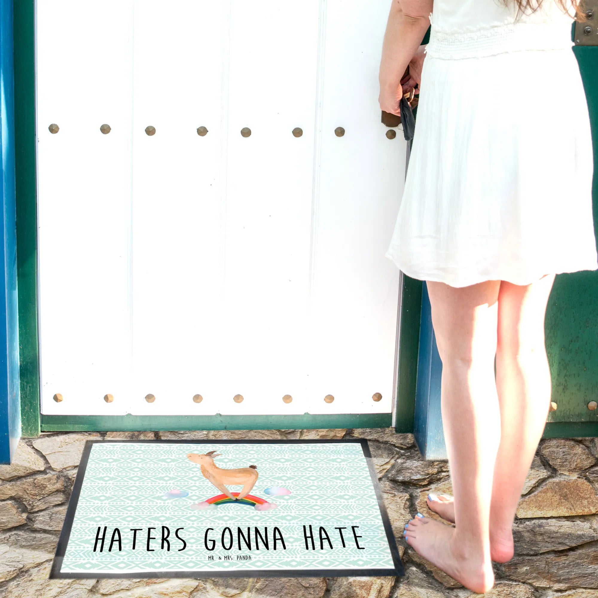 Die wunderschöne Fußmatte von Mr. & Mrs. Panda mit dem süßen Lama Motiv Regenbogen bringt frischen Wind in deinen Eingangsbereich! Sie ist mehr als nur ein Schmutzfänger; sie strahlt Lebensfreude und Persönlichkeit aus. Jedes Lama Motiv wurde von Mrs. Panda liebevoll handgezeichnet und versprüht einen Hauch von Coolness. Die Spruch-Matte "Haters gonna hate" ist perfekt für alle, die ihr Selbstbewusstsein zeigen möchten. Aber nicht nur das; auch alle Lama-Fans und Anhänger des guten Geschmacks kommen bei dieser Fußmatte voll auf ihre Kosten.