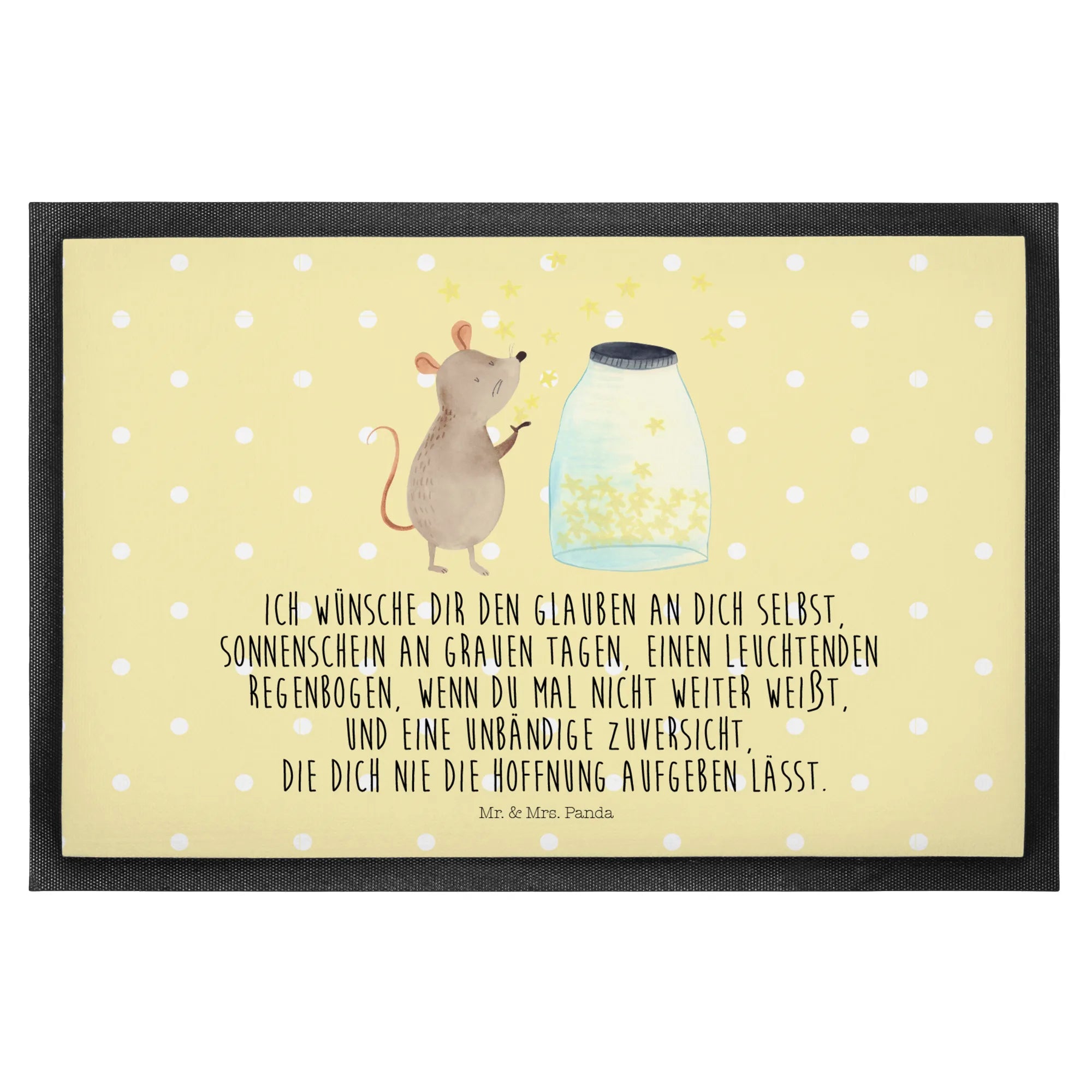 Die wunderschöne Fußmatte mit dem Motiv "Maus Sterne" aus der Small World Kollektion von Mr. & Mrs. Panda ist das perfekte Geschenk für alle, die ihrem Zuhause eine persönliche Note verleihen möchten! Diese liebevoll gestaltete Fußmatte wird schnell zum Blickfang im Eingangsbereich und sorgt für gute Laune, wenn du nach Hause kommst. Die süße Maus, die vor einem Glas voller Sterne sitzt, hat nicht nur ein tolles Design, sondern bringt auch einen liebevollen Slogan mit: "Ich wünsche dir den Glauben an dich selbst, Sonnenschein an grauen Tagen...". Es ist die ideale Mitbringsel für Taufen, Geburtstage oder als kleine Aufmerksamkeit für werdende Eltern.