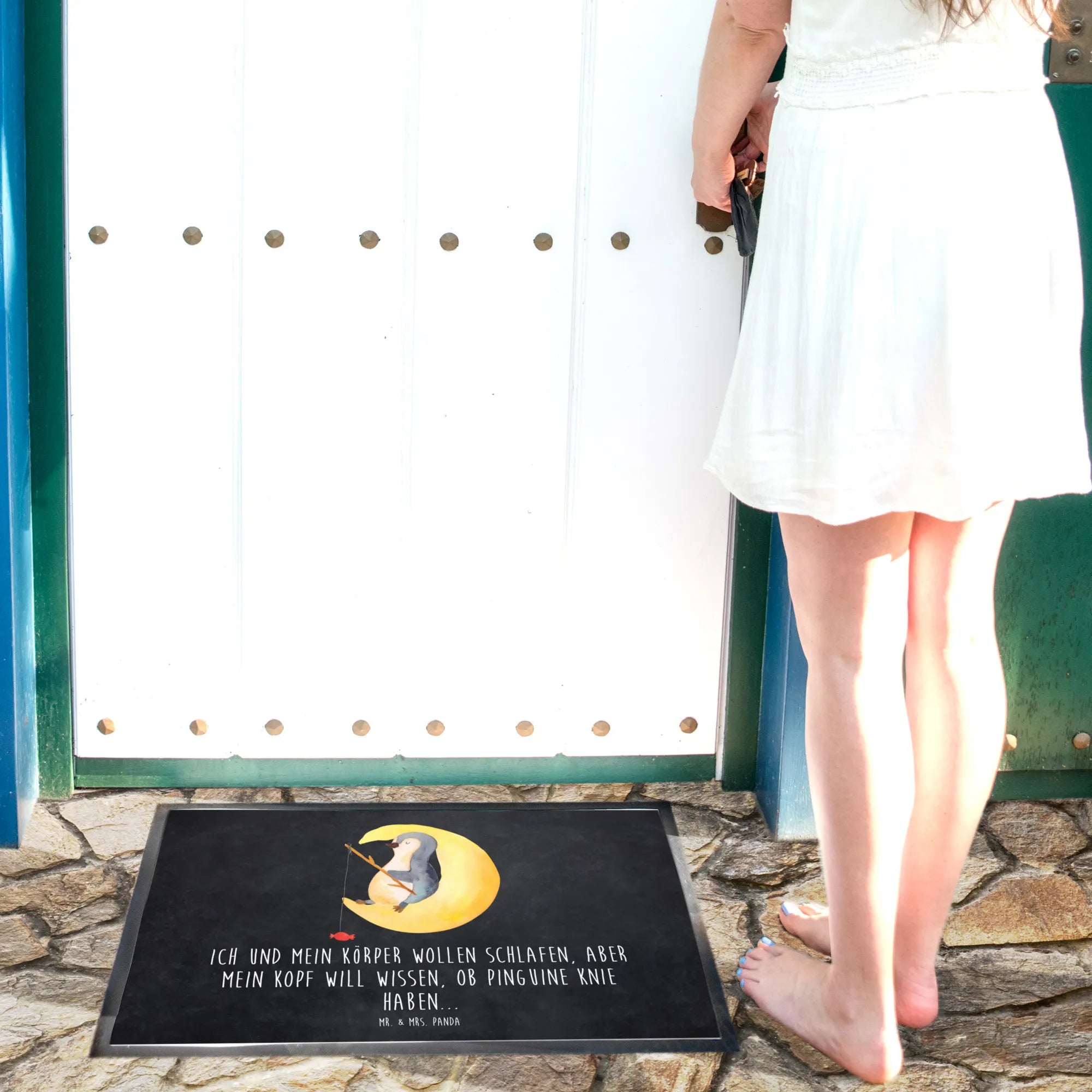 Der süße Pinguin, der es sich auf einer Mondsichel gemütlich gemacht hat, macht die Matte zu einem perfekten Geschenk für Pinguin-Fans und Tierliebhaber. Der witzige Spruch 'Ich und mein Körper wollen schlafen, aber mein Kopf will wissen, ob Pinguine Knie haben...' sorgt für ein Schmunzeln und setzt einen kreativen Akzent im Eingangsbereich.