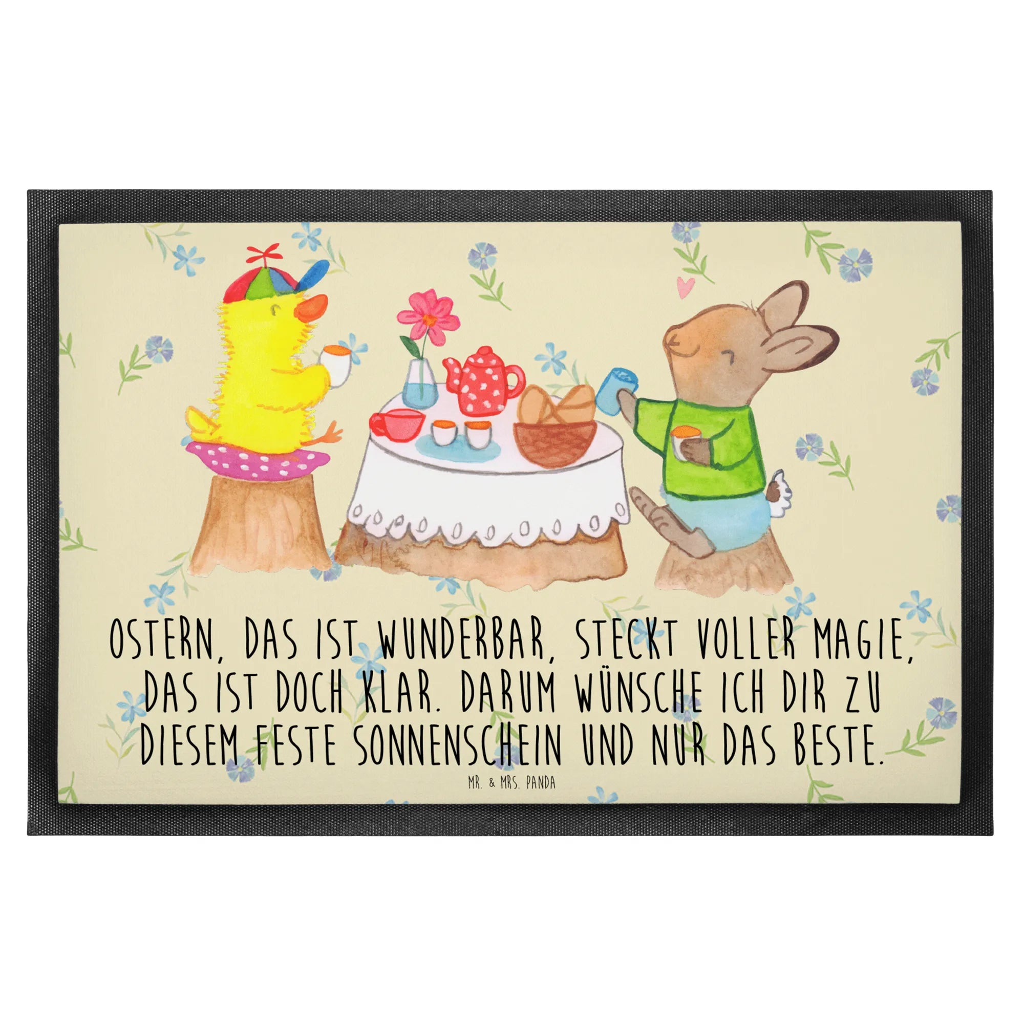 Die zauberhafte Fußmatte "Ostern Frühstück" aus der Ostern-Kollektion von Mr. & Mrs. Panda ist das perfekte Geschenk für alle, die das Osterfest in vollen Zügen genießen möchten. Mit ihrem stimmungsvollen Motiv, das einen süßen Hasen und ein niedliches Küken zeigt, die gemeinsam an einem liebevoll gedeckten Tisch frühstücken, zaubert sie jedem ein Lächeln ins Gesicht. Diese Fußmatte bringt unser Zuhause in fröhliche Osterstimmung und erinnert an kostbare Momente, die wir gemeinsam am Frühstückstisch verbringen.