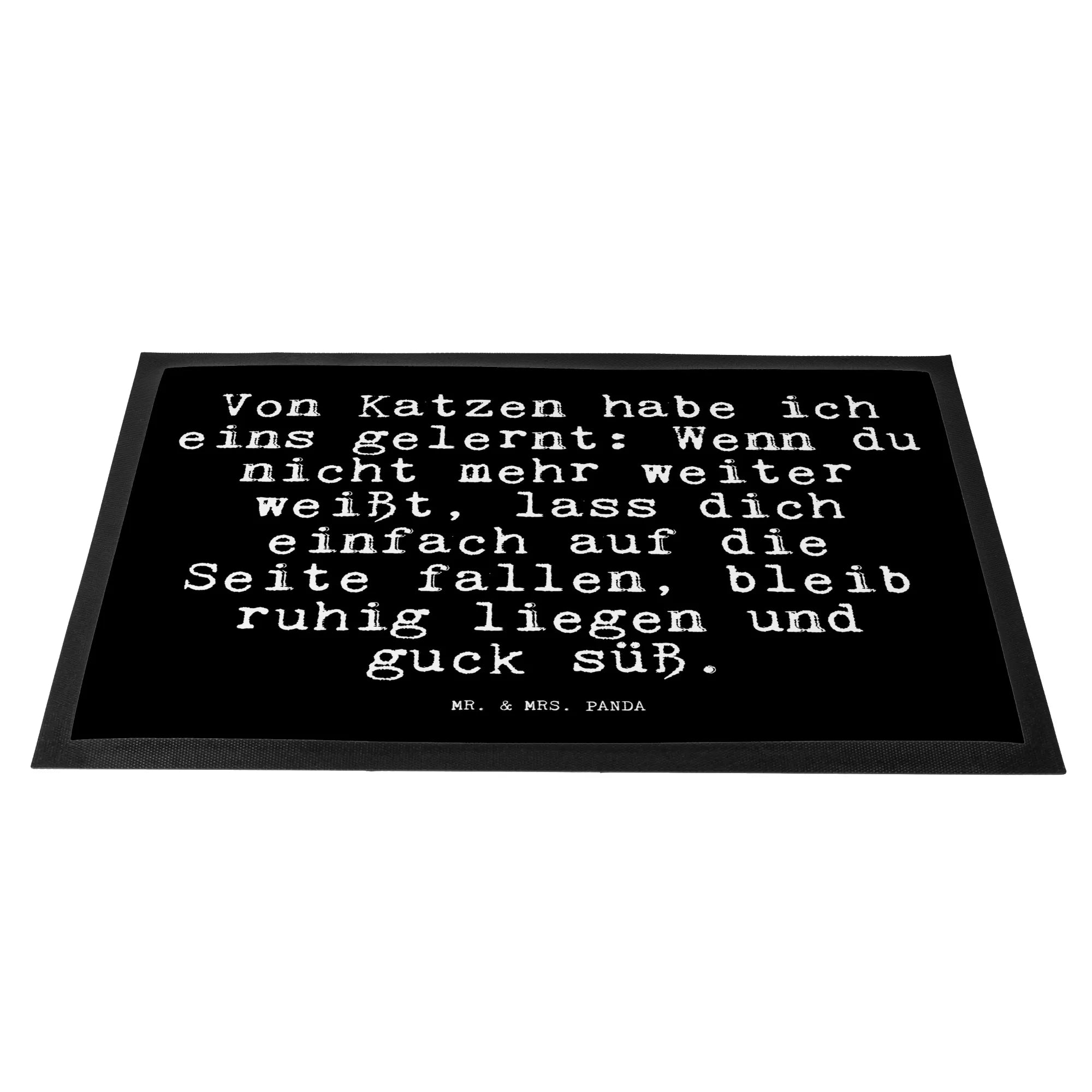 Die Mr. & Mrs. Panda Fußmatte "Von Katzen habe ich eins gelernt: Wenn du nicht mehr weiter weißt, lass dich einfach auf die Seite fallen, bleib ruhig liegen und guck süß." ist nicht nur ein schöner Blickfang, sondern auch unglaublich praktisch! Hergestellt aus hochwertigem Polyesterfilz, bietet sie eine robuste und langlebige Oberfläche, die speziell dafür entworfen wurde, Schmutz und Dreck vor der Haustür zu fangen. Diese Schmutzmatte hat eine gummierte Rückseite, die dafür sorgt, dass sie rutschfest ist und zuverlässig an ihrem Platz bleibt.