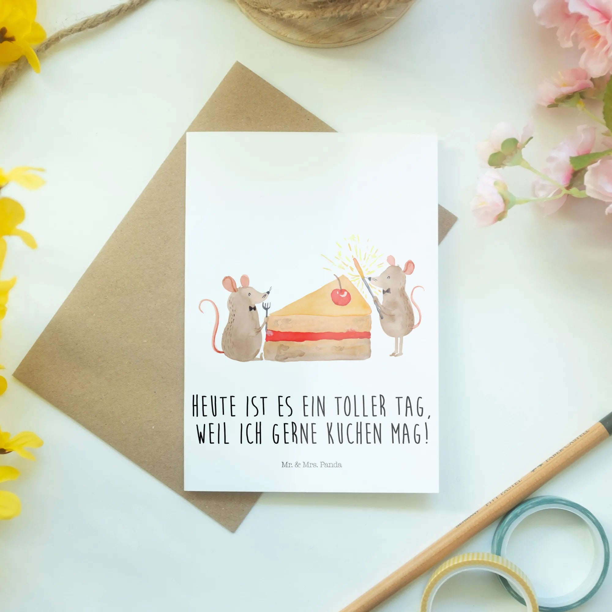 Wenn du also auf der Suche nach einer einzigartigen Grußkarte für Geburtstagsgeschenke bist, bist du hier genau richtig. Verschenke Freude, Spaß und ganz viel Liebe mit der traumhaften Mäuse Kuchen Grußkarte von Mr. & Mrs. Panda.