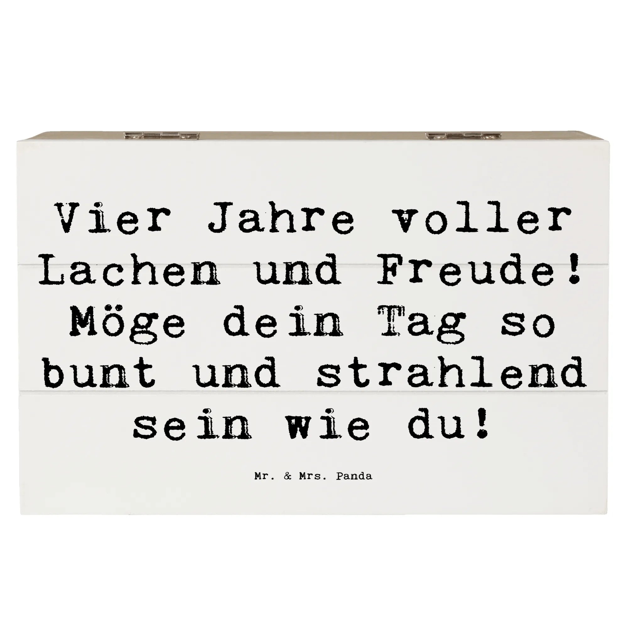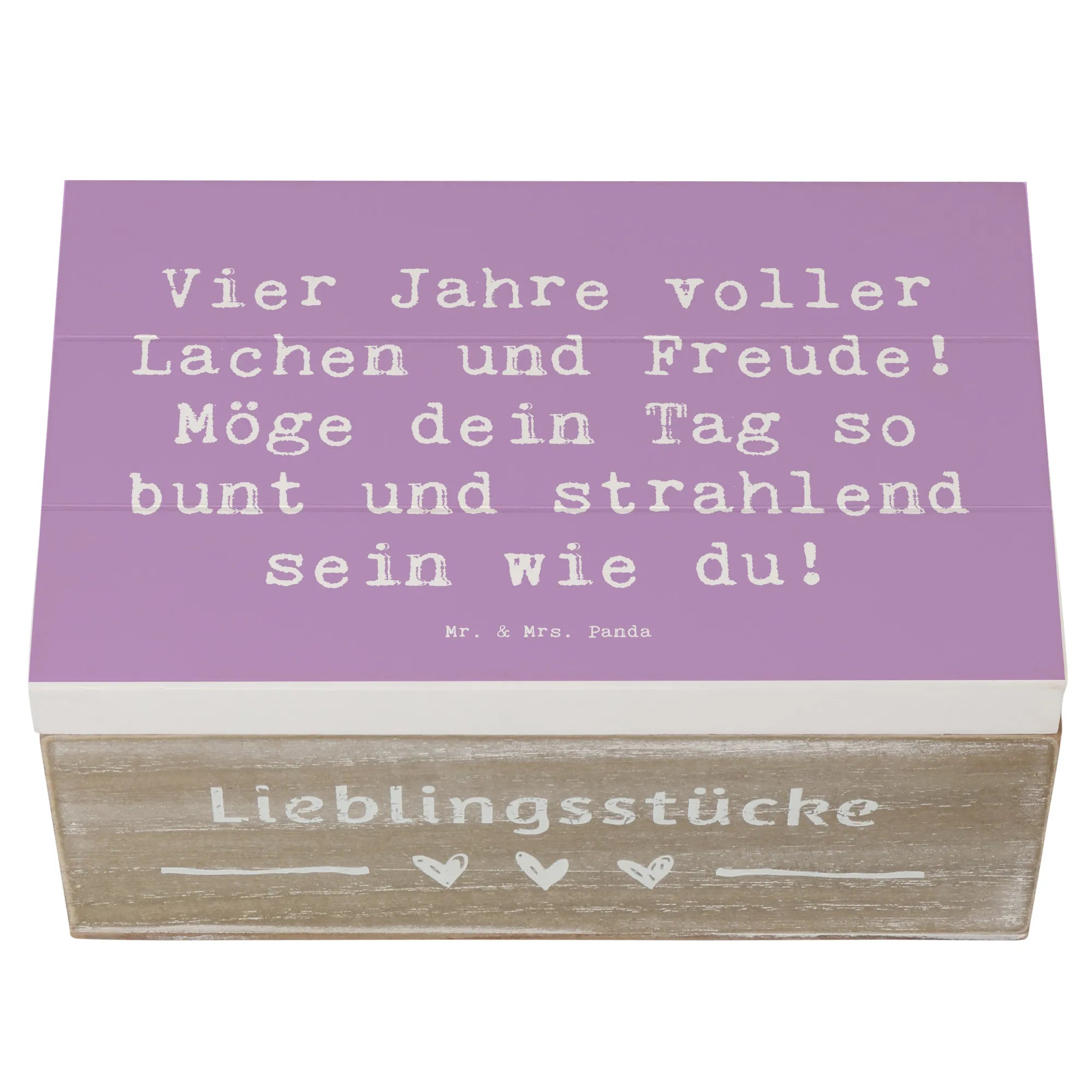 Die wunderschöne Holzkiste zum 4. Geburtstag aus der Kollektion ‚Geburtstag Alter‘ von Mr. & Mrs. Panda ist das perfekte Geschenk für kleine Abenteurer und Sammler von Erinnerungen. Mit ihrem liebevoll gestalteten Design und dem herzerwärmenden Slogan „Vier Jahre voller Lachen und Freude! Möge dein Tag so bunt und strahlend sein wie du!“, bringt sie Freude in jedes Kinderzimmer.
