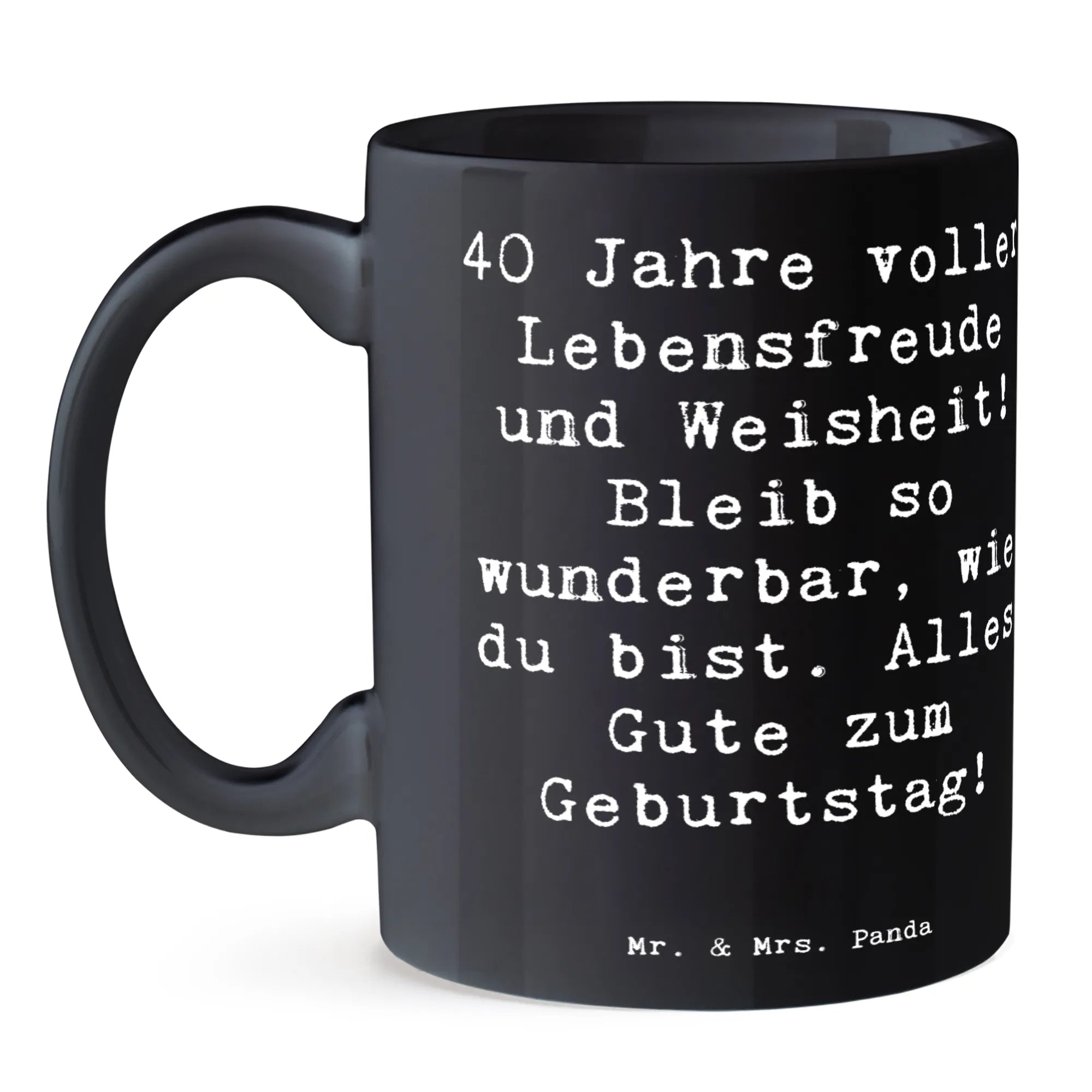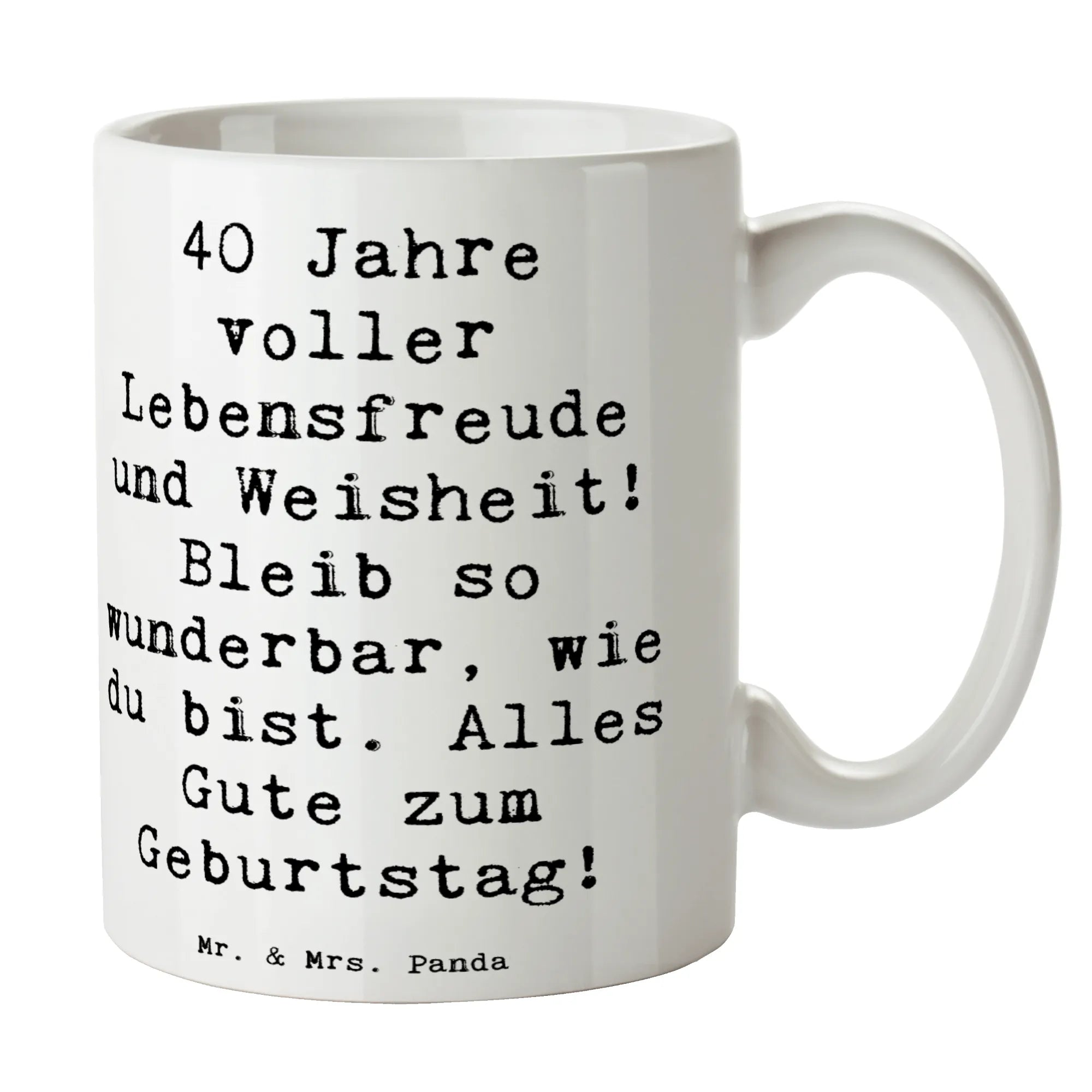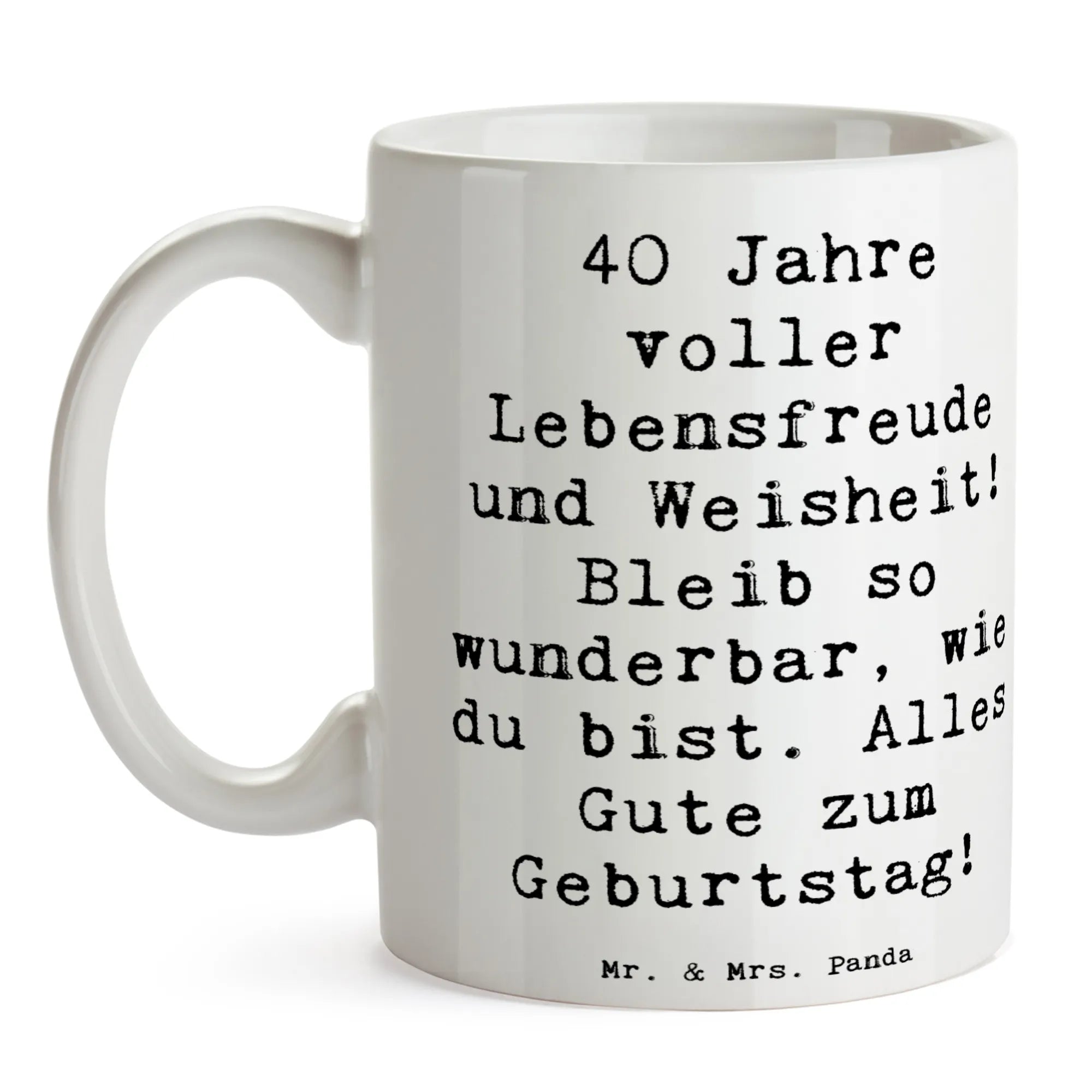 Entdecke die wunderschöne Keramiktasse von Mr. & Mrs. Panda, die perfekt für jeden großen 40. Geburtstag ist! Sie trägt den inspirierenden Spruch: '40 Jahre voller Lebensfreude und Weisheit! Bleib so wunderbar, wie du bist. Alles Gute zum Geburtstag!' und ist ein liebevolles Geschenk, das das Herz des Beschenkten erwärmen wird.