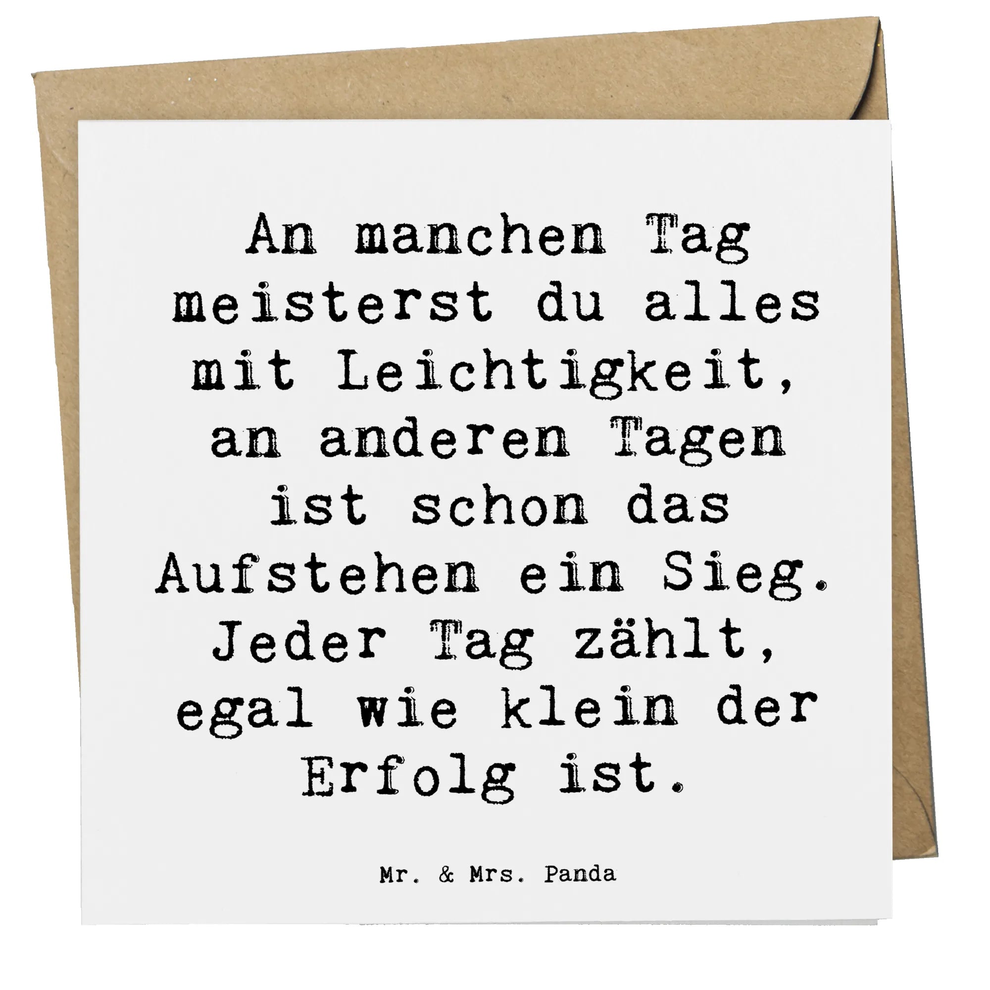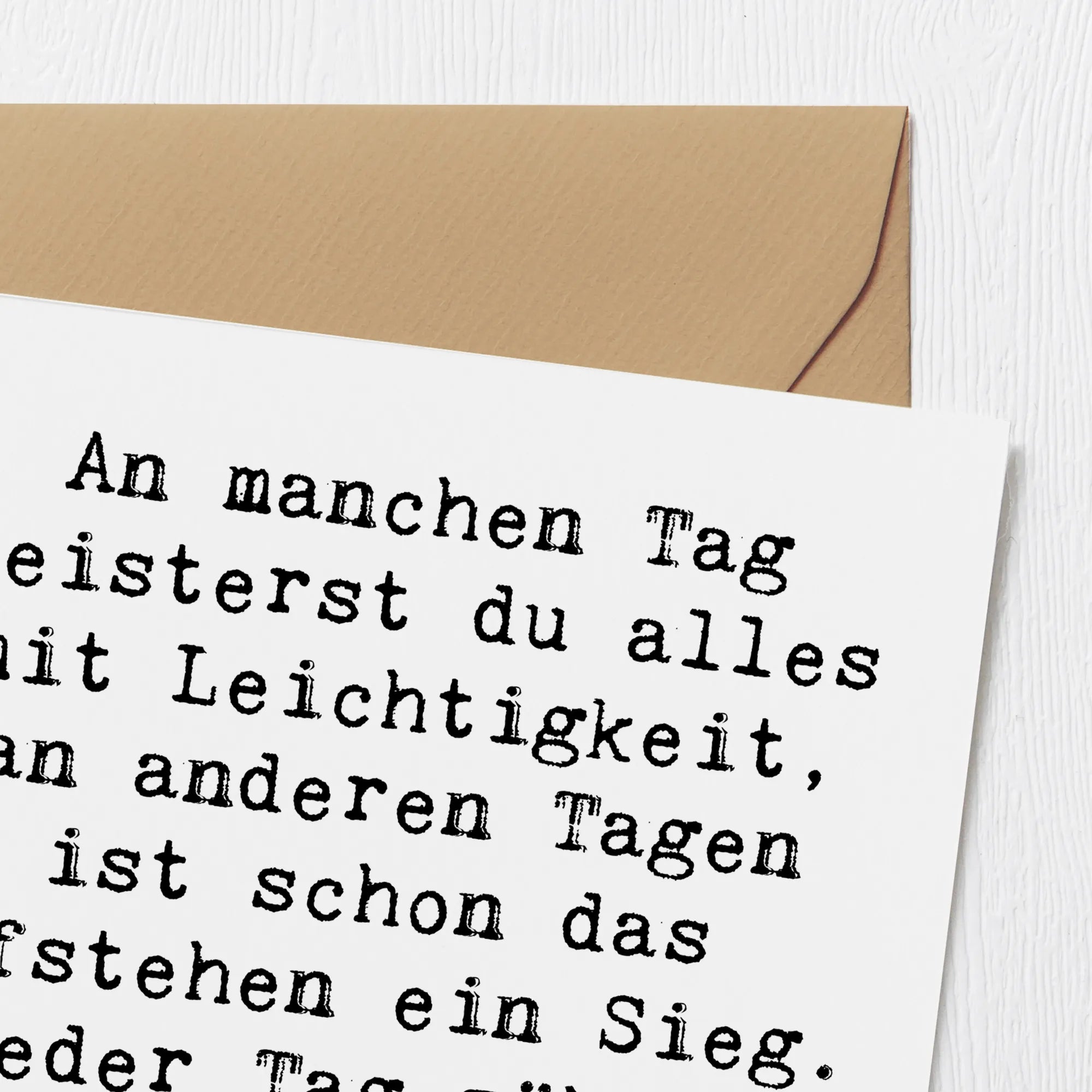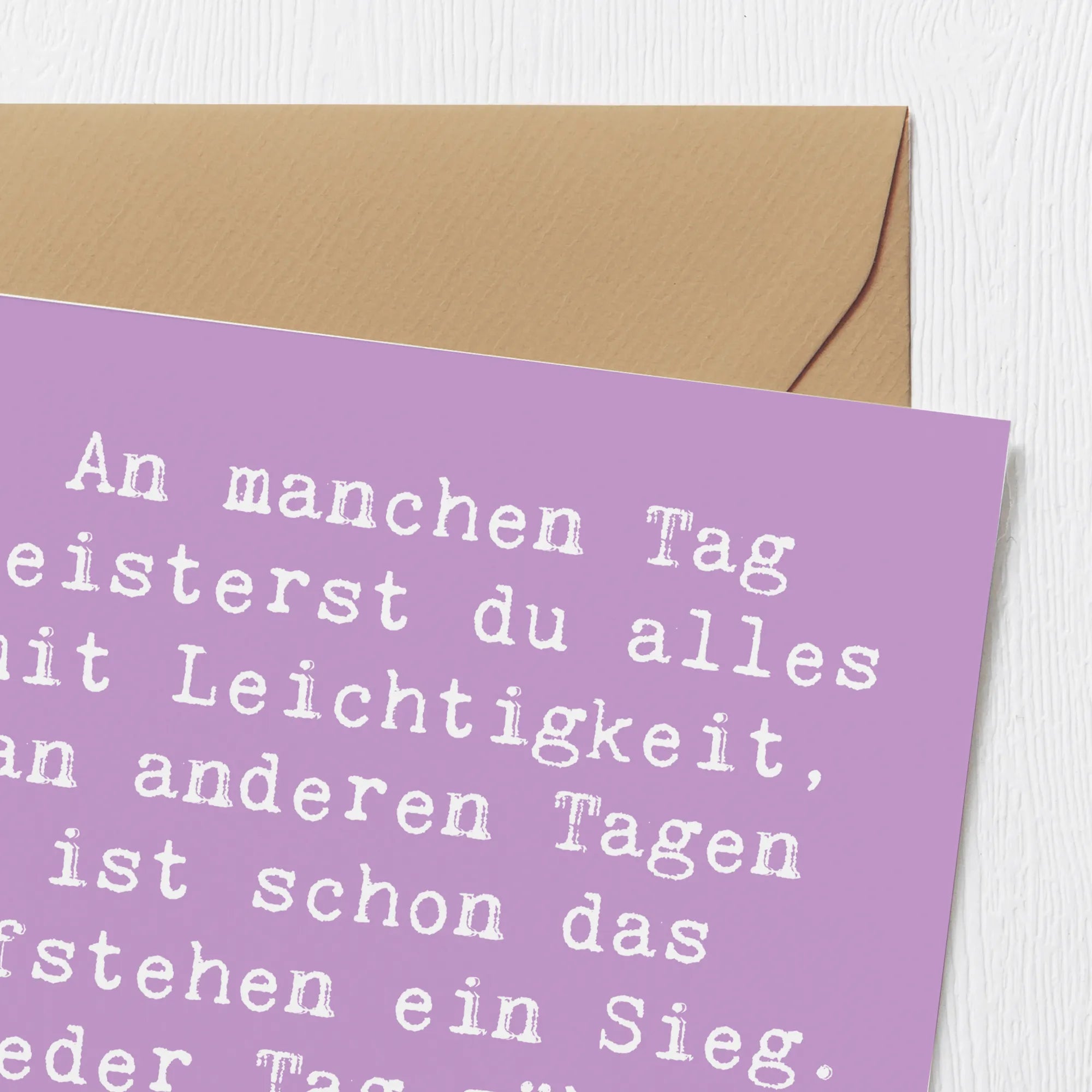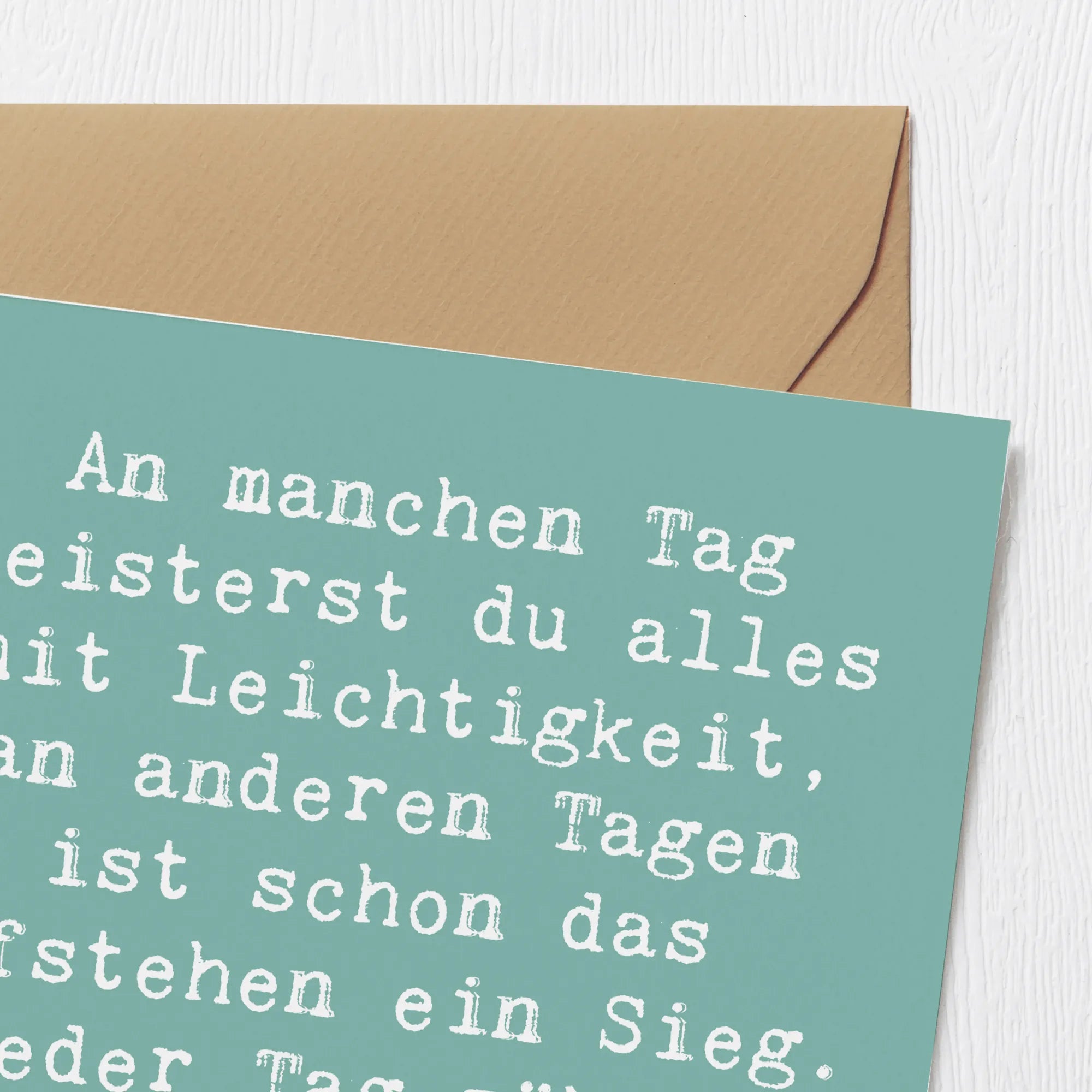 Auf der Vorderseite der Karte findest du einen inspirierenden Spruch: 'An manchen Tagen meisterst du alles mit Leichtigkeit, an anderen Tagen ist schon das Aufstehen ein Sieg. Jeder Tag zählt, egal wie klein der Erfolg ist.' Dieser Spruch wird sicherlich jedes Herz berühren und einen positiven Impuls setzen.