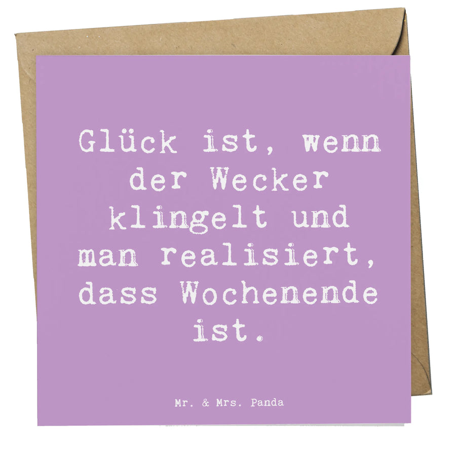 Die Deluxe Karte 'Glück' aus der einzigartigen Kollektion Gefühle & Stimmungen von Mr. & Mrs. Panda ist mehr als nur eine Grußkarte – sie ist ein echtes Stück Freude. Auf der Vorderseite dieser hochwertigen quadratischen Karte strahlt der Spruch 'Glück ist, wenn der Wecker klingelt und man realisiert, dass Wochenende ist' in voller Pracht.