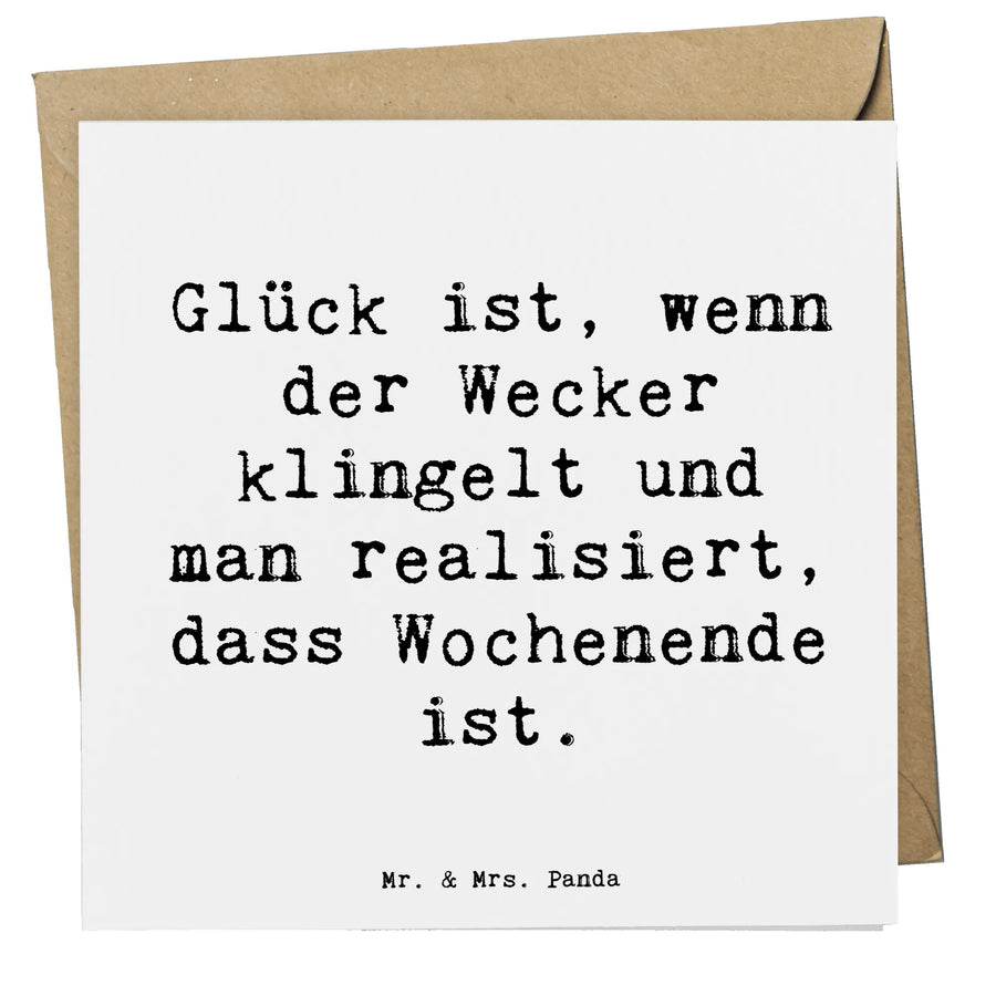 Die Deluxe Karte 'Glück' aus der einzigartigen Kollektion Gefühle & Stimmungen von Mr. & Mrs. Panda ist mehr als nur eine Grußkarte – sie ist ein echtes Stück Freude. Auf der Vorderseite dieser hochwertigen quadratischen Karte strahlt der Spruch 'Glück ist, wenn der Wecker klingelt und man realisiert, dass Wochenende ist' in voller Pracht.