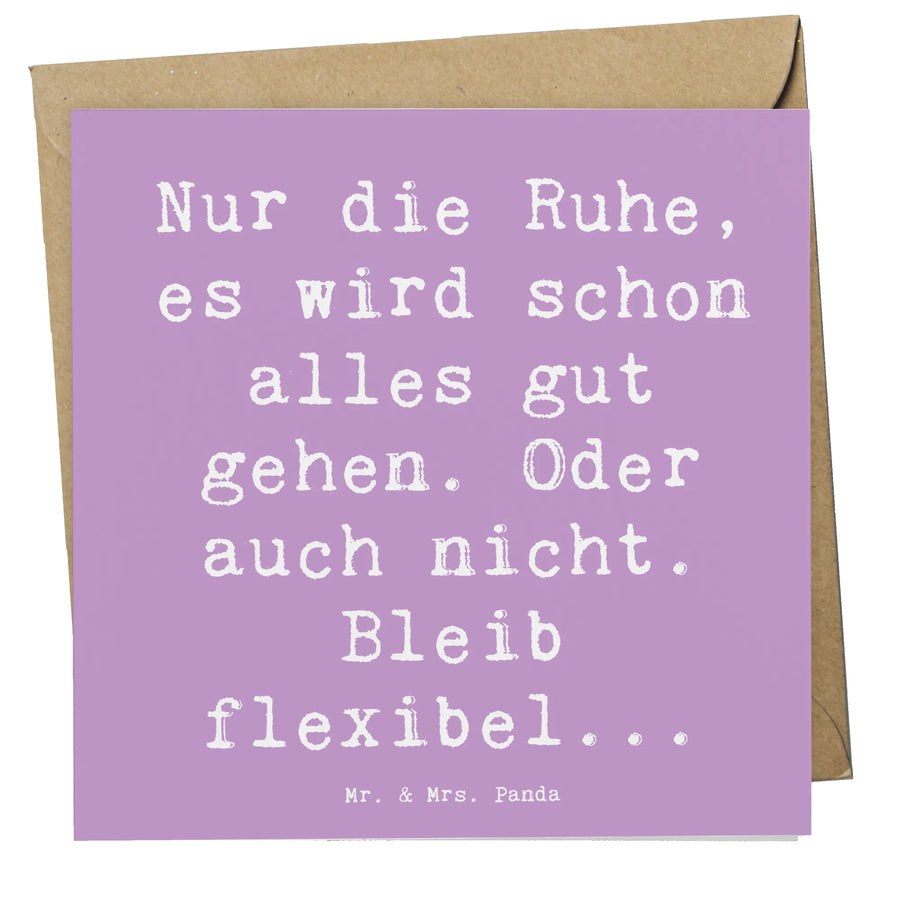 Der Spruch auf der Vorderseite – 'Nur die Ruhe, es wird schon alles gut gehen. Oder auch nicht. Bleib flexibel...' – bringt auf charmante Weise zum Ausdruck, was wir oft in Krisenzeiten benötigen: Gelassenheit. Der hochwertige Karton sorgt für eine edle Optik und hinterlässt einen bleibenden Eindruck. Maße von 140 mm x 140 mm und der edle Umschlag, der inklusive ist, runden dieses wunderbare Gesamtbild ab.