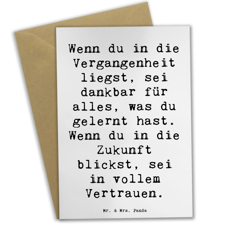 Die Vorderseite der Karte zeigt den schönen Spruch: 'Wenn du in die Vergangenheit liegst, sei dankbar für alles, was du gelernt hast. Wenn du in die Zukunft blickst, sei in vollem Vertrauen.' Diesen kraftvollen Spruch verbindet die Karte mit einem hochglänzenden, eleganten Design, das sofort ins Auge fällt und eine positive Stimmung ausstrahlt.