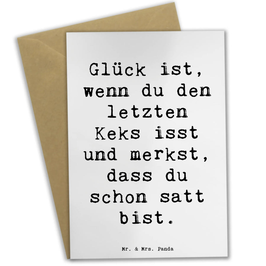 Mit dem Spruch "Glück ist, wenn du den letzten Keks isst und merkst, dass du schon satt bist." auf der Vorderseite, wird die Karte ein Schmunzeln hervorrufen und die Herzen der Beschenkten höher schlagen lassen.
