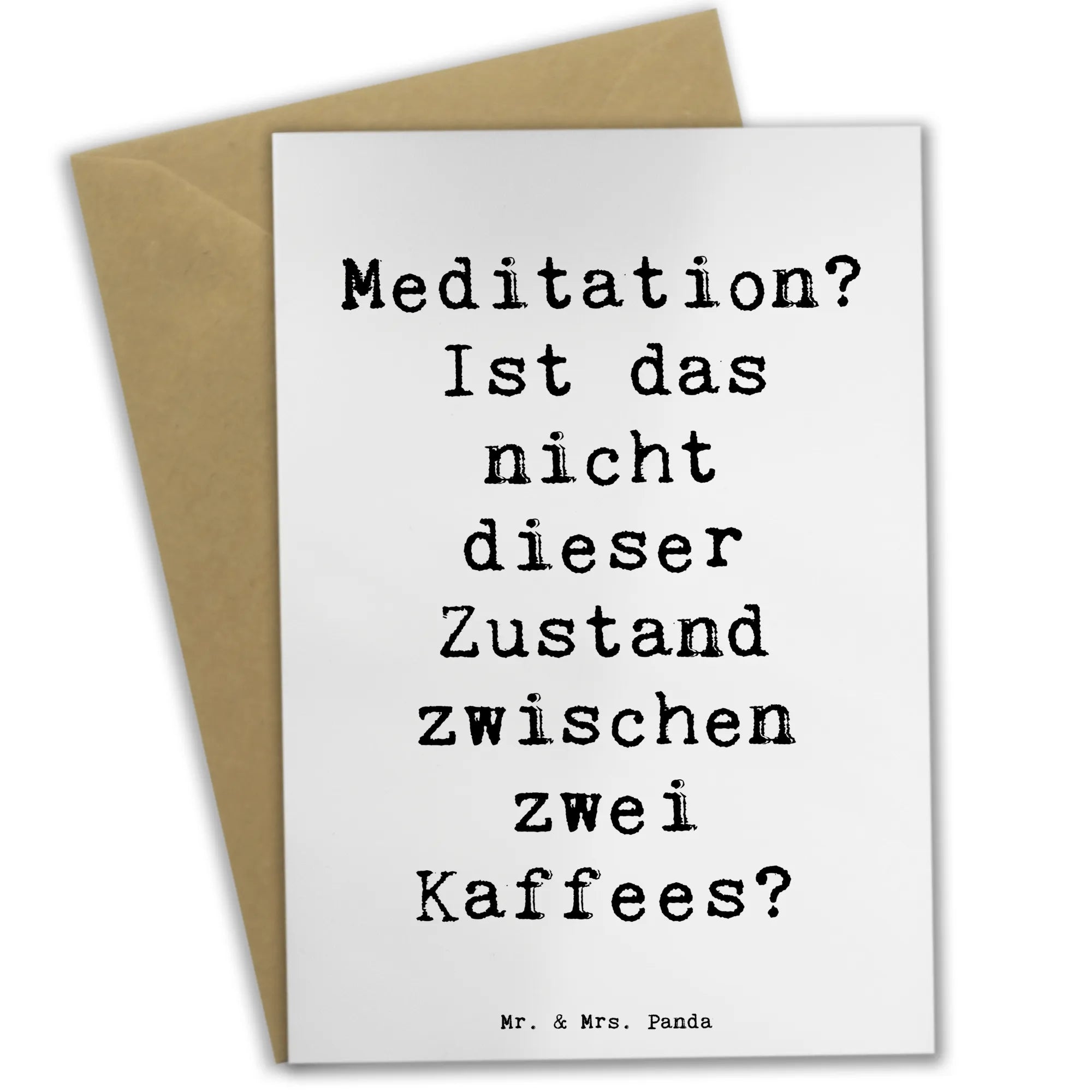 Auf der Vorderseite prangt in stilvollem Design der Spruch: 'Meditation? Ist das nicht dieser Zustand zwischen zwei Kaffees?', der jeden zum Schmunzeln bringt und gleichzeitig zum Nachdenken anregt. Die hochwertige Karte, gefertigt aus edlem 300 Gramm Karton, fühlt sich nicht nur gut an, sondern strahlt auch Eleganz aus.