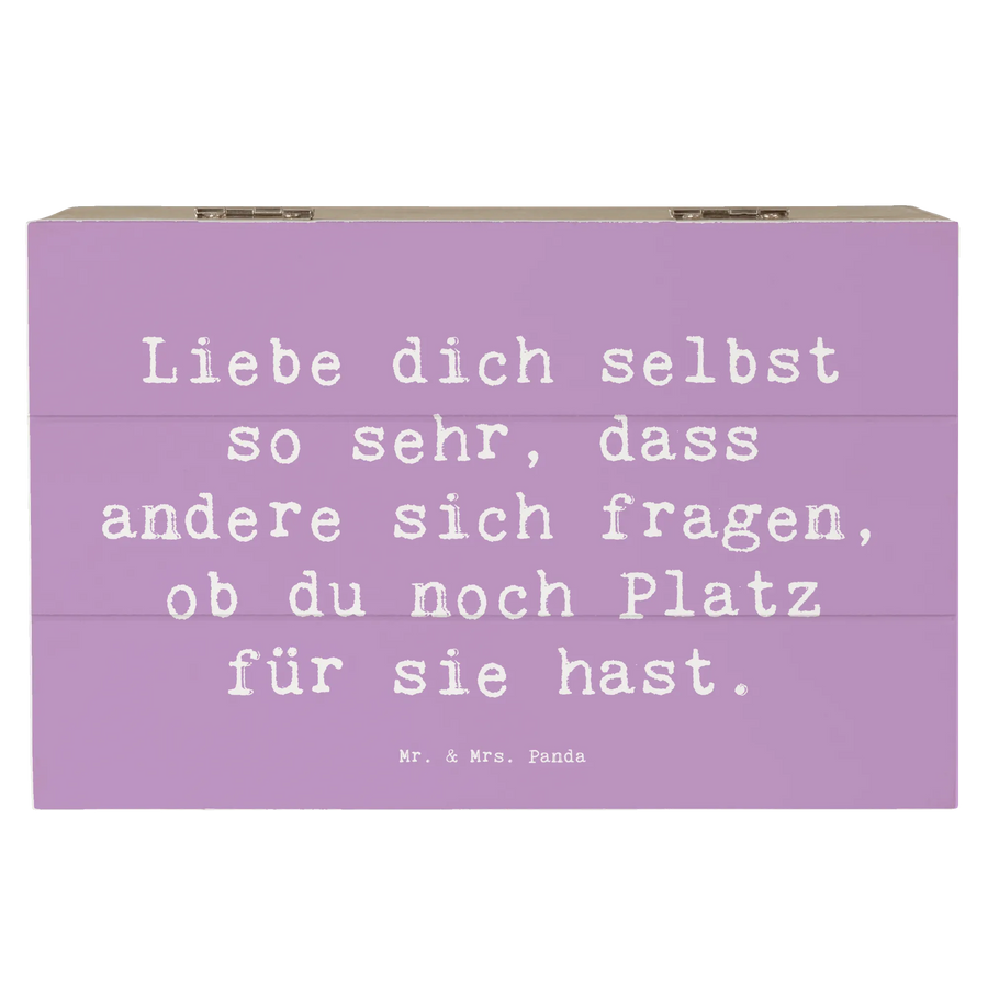 Entdecke die wunderschöne Holzkiste von Mr. & Mrs. Panda, die perfekt für jeden Anlass ist! Diese besondere Kiste mit dem Motiv Selbstakzeptanz und dem inspirierenden Spruch "Liebe dich selbst so sehr, dass andere sich fragen, ob du noch Platz für sie hast" ist nicht nur ein toller Blickfang, sondern auch ein vielseitiges Aufbewahrungsobjekt.
