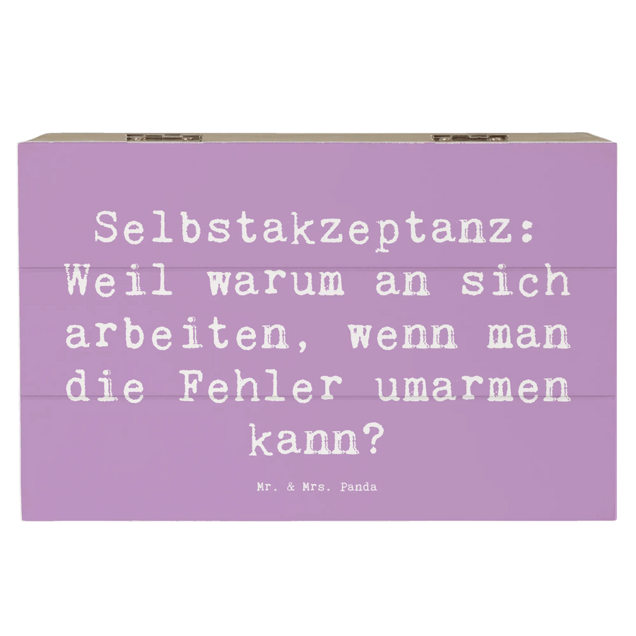 Diese zauberhafte Holzkiste von Mr. & Mrs. Panda aus der Kollektion Gefühle & Stimmungen trägt auf dem zarten Lavendeltraum-Hintergrund den liebevollen Spruch: „Selbstakzeptanz: Weil warum an sich arbeiten, wenn man die Fehler umarmen kann?“ Ein freches, tröstendes Motto, das lächeln lässt und zum Innehalten einlädt.