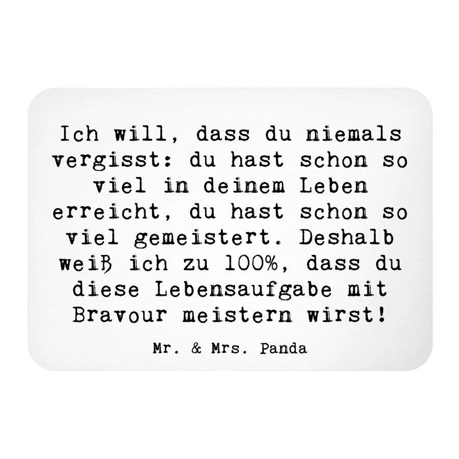 Der Magnet Trost aus der besonderen Kollektion Gefühle & Stimmungen von Mr. & Mrs. Panda ist das perfekte Geschenk für Freunde und Familie, die einen liebevollen Trostspender benötigen. Mit einem motivierenden Spruch, der sagt: "Ich will, dass du niemals vergisst: du hast schon so viel in deinem Leben erreicht, du hast schon so viel gemeistert. Deshalb weiß ich zu 100%, dass du diese Lebensaufgabe mit Bravour meistern wirst!", ist dieser Magnet nicht nur eine zauberhafte Kühlschrankdekoration, sondern auch ein täglicher Reminder, die eigenen Stärken zu erkennen.