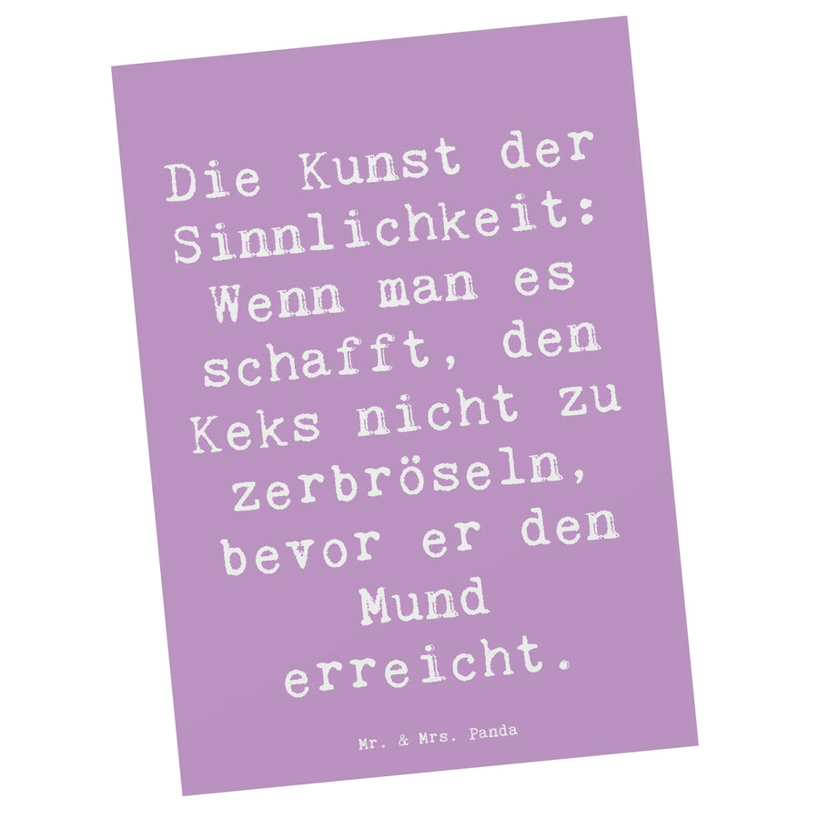 Entdecke die zauberhafte Postkarte "Sinnlichkeit" aus der besonderen Kollektion "Gefühle & Stimmungen" von Mr. & Mrs. Panda! Diese einzigartige Karte mit dem witzigen Spruch "Die Kunst der Sinnlichkeit: Wenn man es schafft, den Keks nicht zu zerbröseln, bevor er den Mund erreicht." ist das perfekte Geschenk für alle, die das Leben in vollen Zügen genießen.