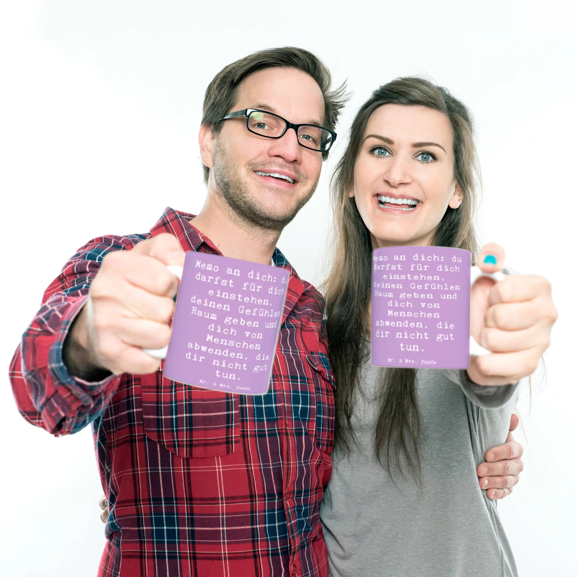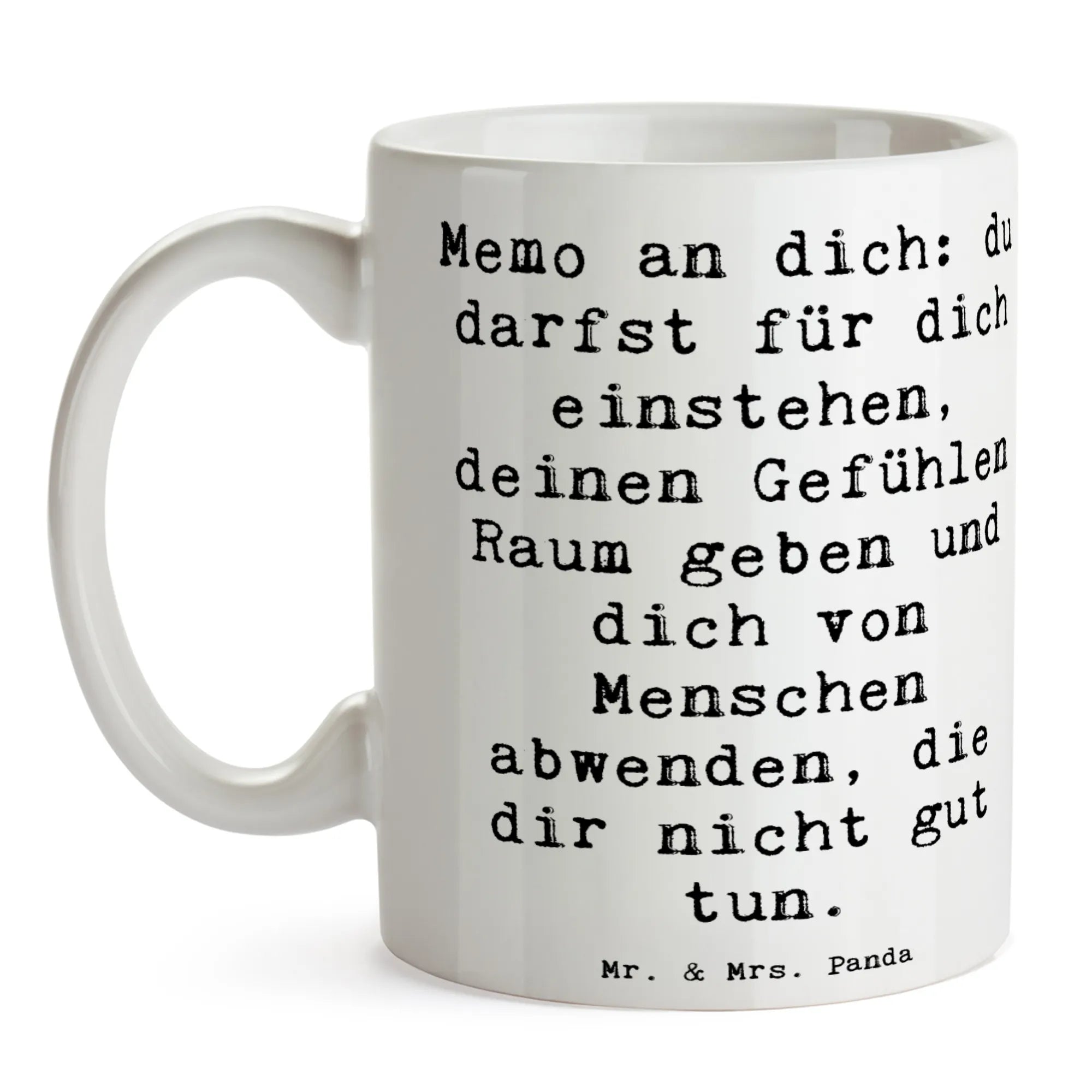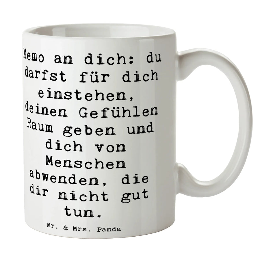 Das brillante Design zeigt den Slogan: "Memo an dich: du darfst für dich einstehen, deinen Gefühlen Raum geben und dich von Menschen abwenden, die dir nicht gut tun." Mit ihrer besonderen, glänzenden Oberfläche und dem Lavendeltraum-Hintergrund ist die Tasse nicht nur funktional, sondern auch ein echter Hingucker.