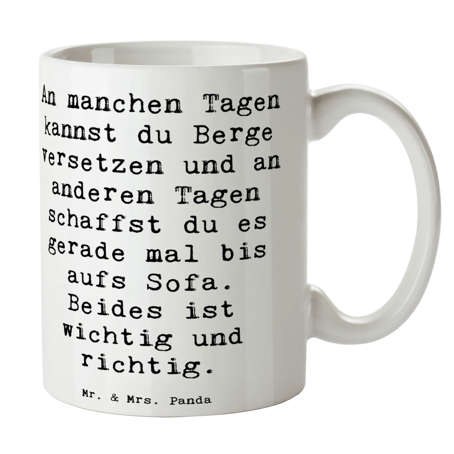 Diese Kaffeetasse aus der Kollektion Gefühle & Stimmungen trägt den liebevollen Spruch: „An manchen Tagen kannst du Berge versetzen und an anderen Tagen schaffst du es gerade mal bis aufs Sofa. Beides ist wichtig und richtig.“ Ein Satz, der tröstet, ermutigt und daran erinnert, dass es in Ordnung ist, verschieden zu sein – so wie die Tage auch.